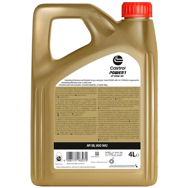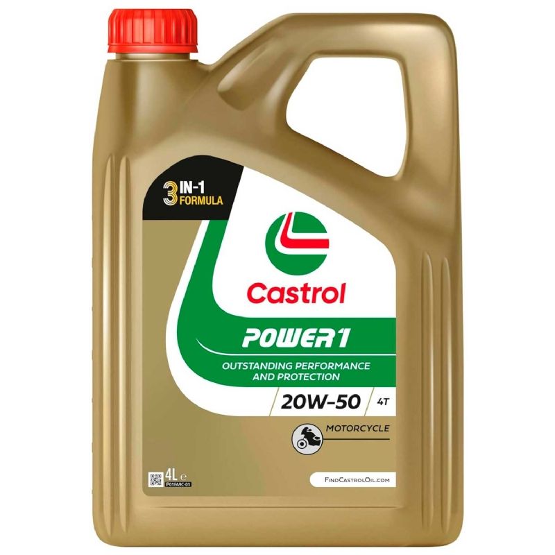 Aceite Motor Castrol Power 1 4T 20w50 4 Litros (Nueva Fórnula). El aceite de moto Castrol Power 1 4 Tiempos 20w50 semisintético con su fórmula Power Protection, ofrece elevadas prestaciones a la moto. Castrol Power 1 4T 20w50 garantiza el máximo rendimiento y evita la acumulación de los sedimentos que reducen la potencia. Con el aceite Castrol Power 1 se consigue un aumento de la potencia y una mayor vida útil de los motores de 4 tiempos.