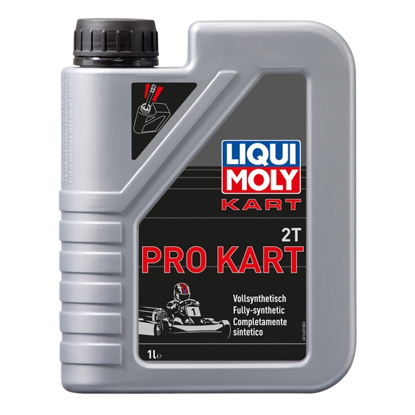 Aceite de motor Liqui Moly Pro Kart sintético de alto rendimiento para motores de competición de 2 tiempos con refrigeración de aire y agua en karts, quads y motocicletas que funcionan con gasolina. Para lubricación separada y por mezcla. Automezclante. Se deben respetar las relaciones de mezcla de los fabricantes de los vehículos o de los motores.