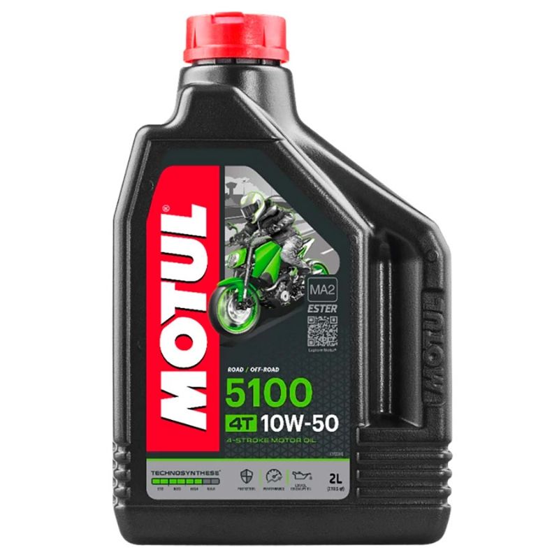 Aceite para motor de moto 4 tiempos Motul 5100 4T 10W50 2 Litros. El aceite Motul 5100 10W50 Technosynthese reforzado con Ester garantiza una protección excelente a altas temperaturas y la máxima resistencia contra el desgaste. Motul 5100 10W50 permite su utilización con catalizadores y está especialmente desarrollado para motores 4 tiempos con cajas de velocidades integradas o no y embrague bañado en aceite o en seco.