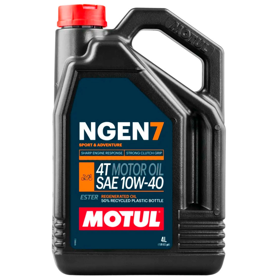 Aceite Motul NGEN 7 10W40 4T 4 Litro. El nuevo aceite de moto MOTUL NGEN 7 para motores de 4T representa una revolución en el cuidado y rendimiento del motor. Se trata de una fórmula avanzada creada para maximizar el rendimiento y la durabilidad de las motocicletas de alta gama, ya sean de carretera o todoterreno, con motores de 4 tiempos.