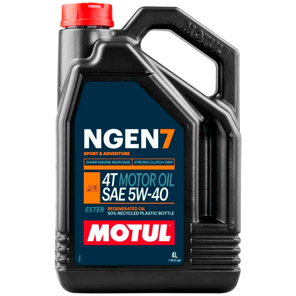 Aceite Motul NGEN 7 5W40 4T 4 Litros. El nuevo aceite de moto MOTUL NGEN 7 para motores de 4T representa una revolución en el cuidado y rendimiento del motor. Se trata de una fórmula avanzada creada para maximizar el rendimiento y la durabilidad de las motocicletas de alta gama, ya sean de carretera o todoterreno, con motores de 4 tiempos.