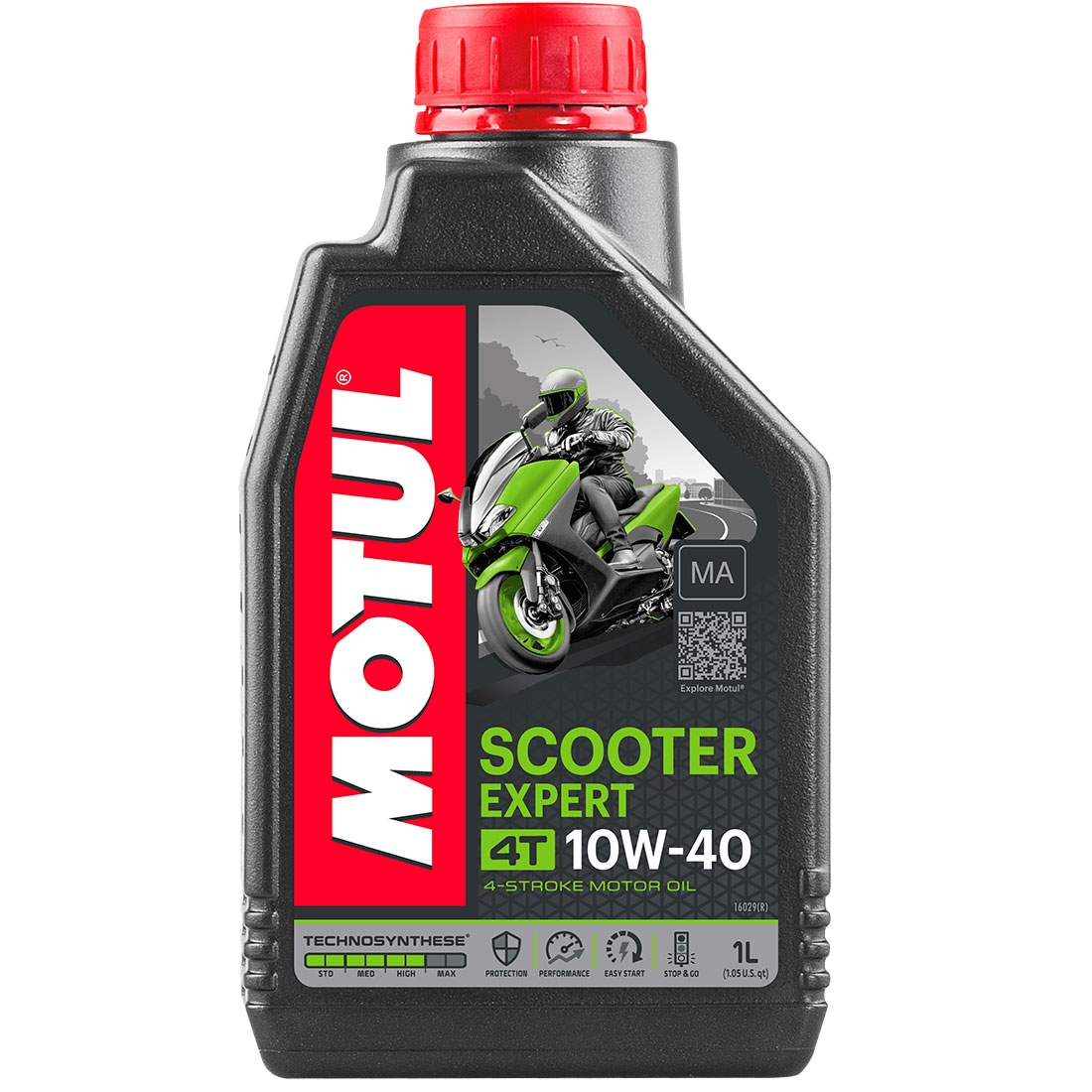 Aceite para motor de 4 tiempos Motul Scooter Expert 4T MA SAE 10W40 1 Litro. El aceite Motul Scooter Expert 10W40 Technosynthese ofrece una excelente resistencia y protección en motores de sooters y maxi scooters de 4 tiempos con variadores automáticos (cualquier cilindrada). El aceite Motul Scooter Expert 10W40 con bases sintéticas y aditivos garantiza un óptimo comportamiento anti-fricción y antidesgaste así como una reducción en el coeficiente de fricción. La norma JASO MA garantiza el perfecto funcionamiento en los embragues surmegidos.