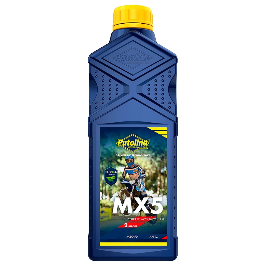 Aceite Putoline MX 5 1 Litro. MX5 es un aceite sintético para motos todoterreno de 2 tiempos. El lubricante ha sido ampliamente probado en circuitos de todo el mundo y se recomienda su uso en los motores empleados para las modalidades de Enduro y Motocross. Gracias a su composición sintética y a su sistema de aditivos de última generación, MX5 proporciona una protección óptima a todos los componentes críticos del motor. También evita la formación de depósitos perjudiciales de carbonilla en los pistones, los cilindros y las válvulas de potencia, y ofrece una película lubricante duradera en todas las condiciones.