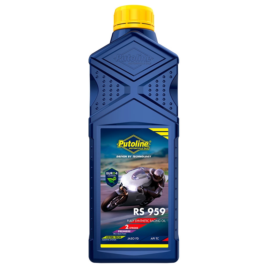 Aceite Putoline RS 959 1 Litro. RS 959 es un aceite de motor sintético con los revolucionarios aditivos Ester Tech. El producto garantiza una fuerza de la película excepcional y absorción de la presión incluso en las condiciones de competición más extremas. El lubricante Putoline RS 959 está especialmente diseñado para motores de premezcla o inyección de 2 tiempos que se usan en condiciones de competición extremas. Mezcla recomendada: 2-4 %.
