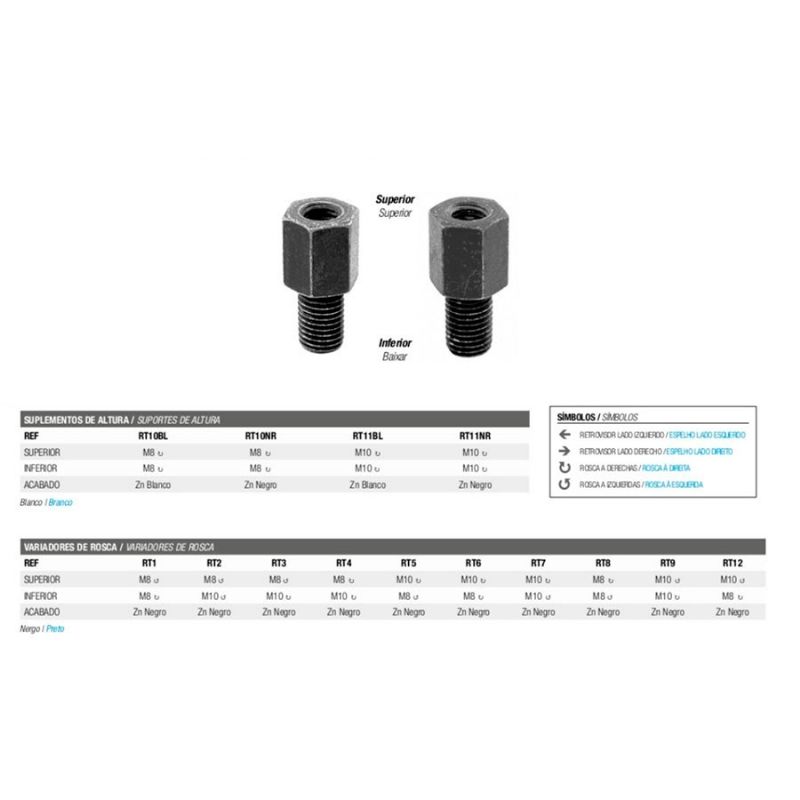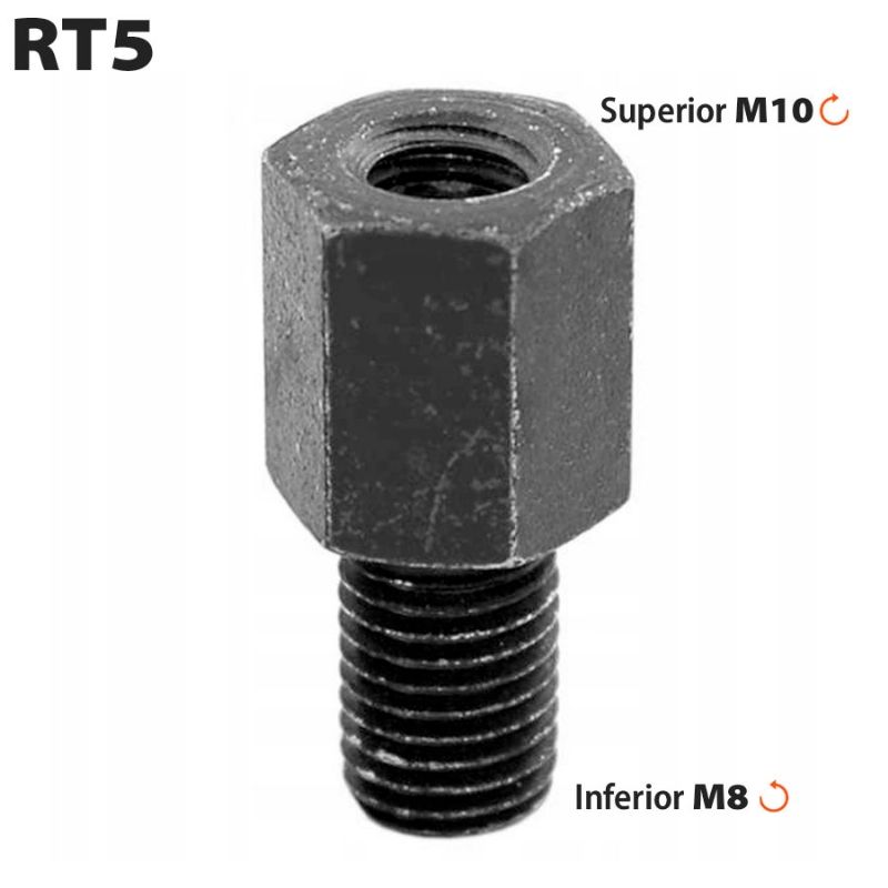 Adaptador espejo Vicma RT5. Variador de rosca para el espejo. M10 ↻ superior y M8 ↺ inferior. Realizado en acero zincado negro. Precio por unidad.