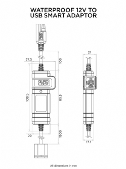 - 1 Quad Lock® Waterproof 12V to USB Smart Adaptor con puerto USB-A hembra de 1.5M y cable SAE de 10cm preinstalado.