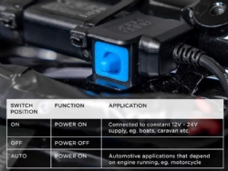 - La función Auto mantiene el dispositivo apagado hasta que la tensión de entrada suba por encima de 13,5V y se apaga cuando caiga por debajo de 12,5V, evitando el agotamiento de la batería en motocicletas, ATVs, etc.