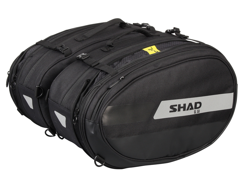Alforjas bolsas laterales Shad SL58 X0SL58. Las nuevas alforjas laterales y expandibles Shad SL58, cuentan con una gran capacidad, siendo muy funcionales para los motoristas que efectúan largos viajes. Las alforjas laterales Shad SL58 son compatibles con las nuevas fijaciones Side Bag Holder aunque se pueden fijar también mediante correas de velcro (incluidas). Confeccionadas en Polyester muy resistente y duradero.