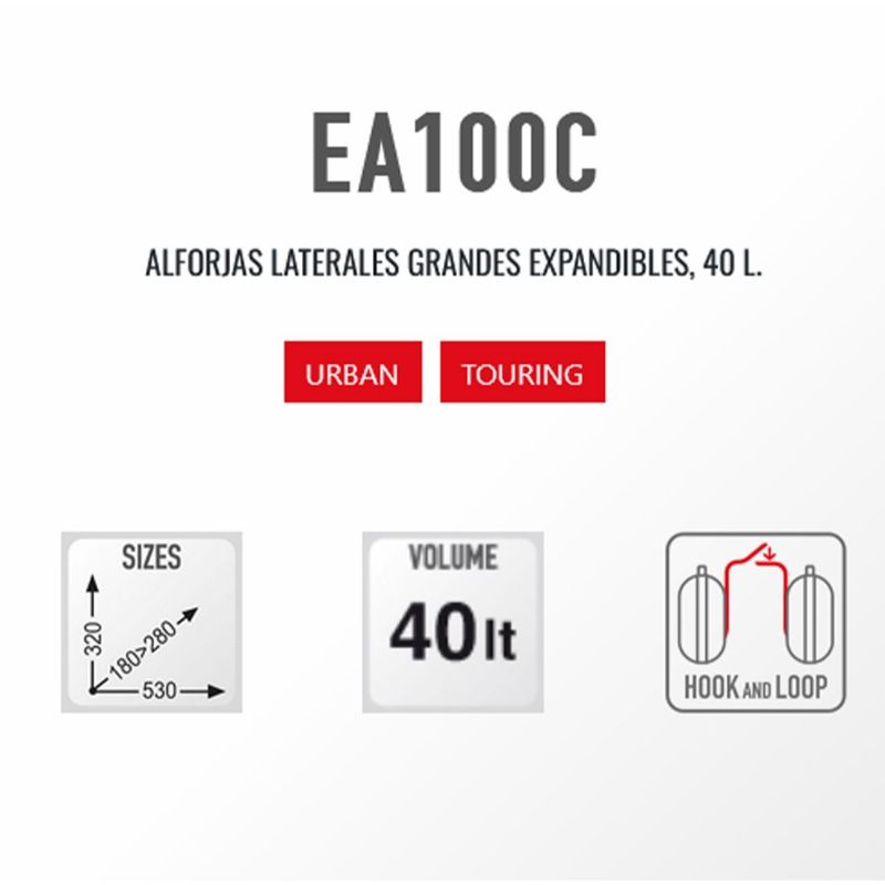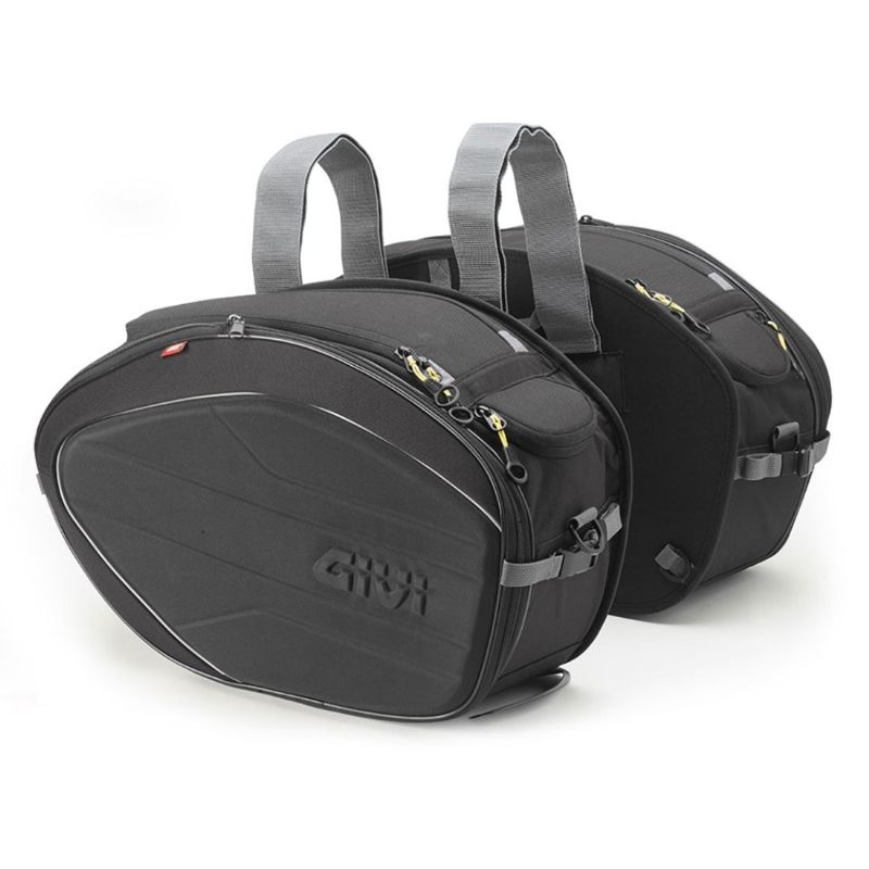 Alforjas laterales Givi EA100C Easy-T 40 Litros. Las alforjas laterales Givi EA100C Easy-T son la solución perfecta para aquellos motociclistas que necesitan espacio adicional de almacenamiento en sus viajes. Con una capacidad total de 40 litros y la capacidad de expandirse aún más, estas alforjas ofrecen una gran capacidad de carga para tus aventuras en moto.