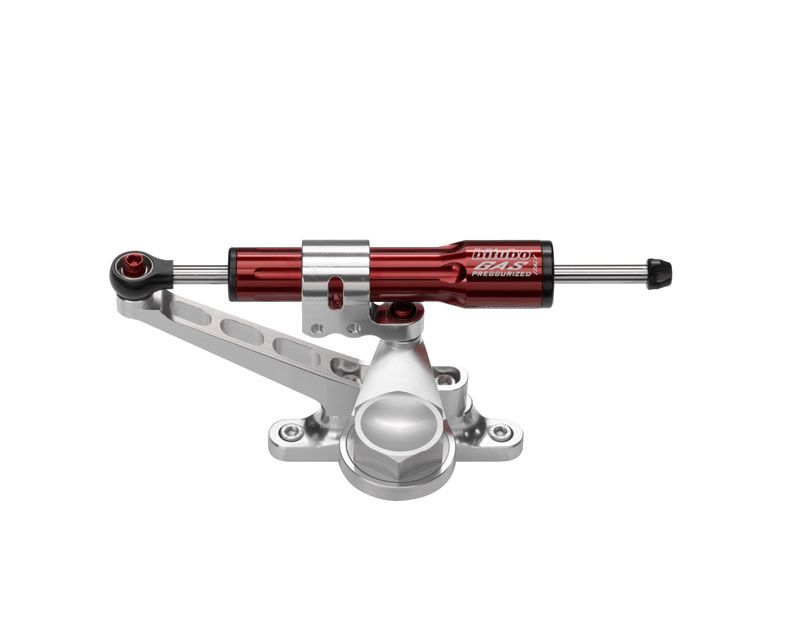 Amortiguador de dirección bitubo con anclajes fabricados aluminio mecanizado. Cámara de compensación coaxial presurizada con nitrógeno. 18 clics de ajuste para una calibración precisa.
