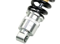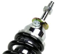 Cuerpo fabricado en acero especial con tratamiento antifricción de larga duración. Las sujeciones donde va anclado estan fabricadas en aluminio cnc de peso muy reducido. Precarga de muelle con tuerca de aluminio milimetrica. Regulación en extensión continua. Compresión regulable en 12 clicks. Existen 2 versiones diferentes dependiendo de la motocicleta, la 01 (muelle rojo) y la 02 (muelle negro). Ambas versiones son exactamente iguales a excepción de color del muelle.