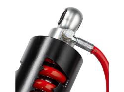 Este nuevo amortiguador Bitubo HZM-11 monocamara de gas presurizado es la evolución del HZT. Diseñado para la Yamaha T-max 500, el departamento técnico a realizado un diseño con importantes mejoras respecto al anterior modelo. El principal objetivo de la marca italiana a sido satisfacer a los apasionados de la maxi scooter de carácter deportivo que echaban en falta la posibilidad de ajustar el hidráulico de forma rápida y sencilla. El nuevo modelo viene con la cámara de compensación separada y regulación externa, conectada con tubo flex capaz de aguantar altísima presiones, quedando asi el problema resuelto.