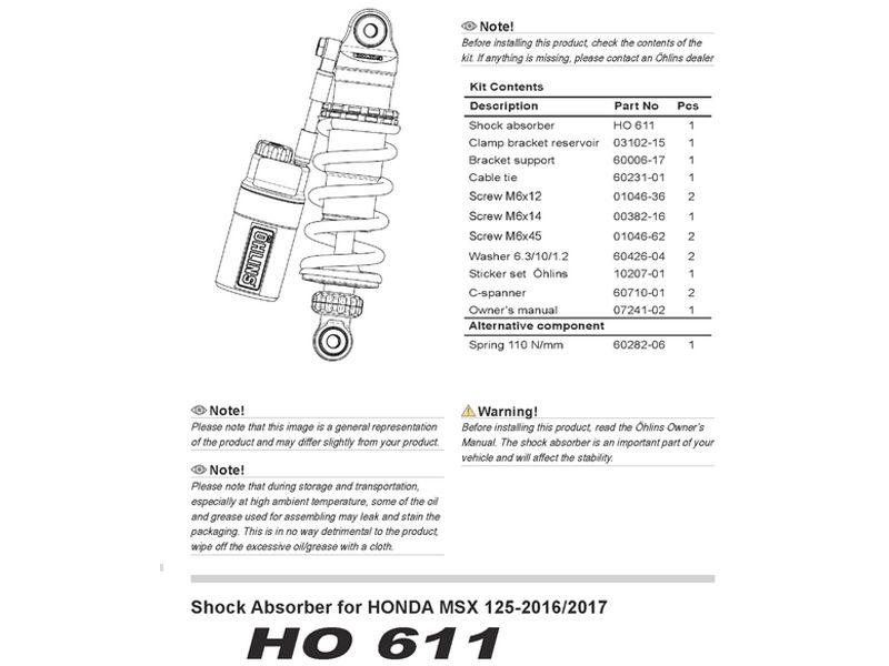 Amortiguador trasero Ohlins HO 611 S36HR1C1 Honda MSX 125 2016-18. Amortiguador Öhlins STX36 de gas de alta presión tipo monotubo con depósito externo conectado en la manguera. Este amortiguador totalmente regulable tiene un pistón de 36 mm y ofrece un mayor rendimiento que al amortiguador original. Cuenta con la tecnología Öhlins STX, que se ha desarrollado y perfeccionado a lo largo de los años para mejorar el rendimiento de muchas motos.