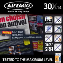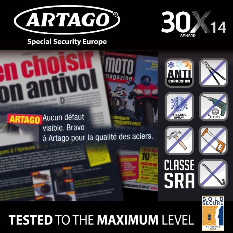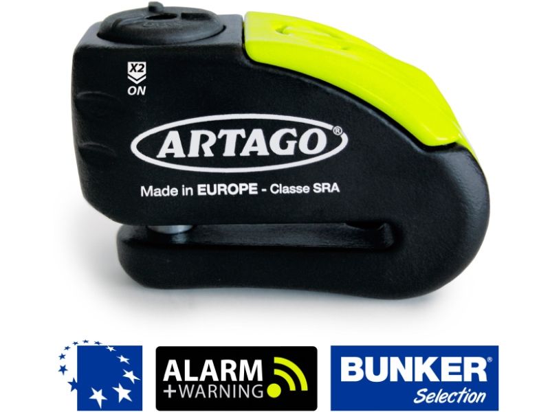 Antirrobo Disco con Alarma Artago 30X14 Sensor (bulón de 14 mm). Antirrobo de disco con alarma Artago 30X14 (bulón 14 mm). El antirrobo de disco con alarma Artago 30X14 es uno de los dispositivos de seguridad más avanzados para moto, perteneciente a la exclusiva gama Bunker Selection de Artago. Fabricado en acero forjado de máxima resistencia y equipado con un bulón de 14 mm, este candado de disco está considerado como un antirrobo de nivel máximo por su resistencia y por su sofisticado sistema electrónico de alarma.