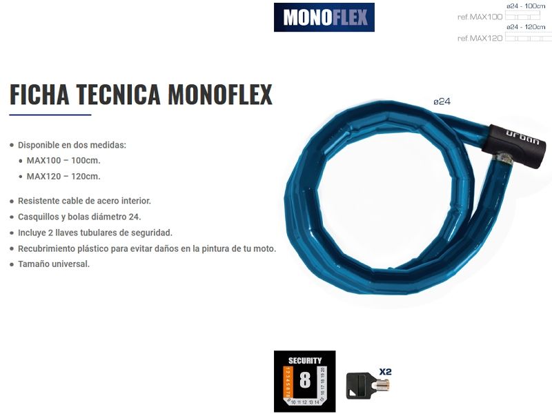 Antirrobo Monoflex Urban Security MAX120 Monoflex. El antirrobo articulado para motos Urban Monoflex se caracteriza por su ligereza y óptima resistencia. Con unas dimensiones totalmente universales, se puede utilizar en bicicletas, moto y scooters. El antirrobo Urban Monoflex cuenta con un resistente cable de acero que está protegido por casquillos y bolas de acero blindadas de diámetro 24mm que lo hace flexible a la vez que resistente. Además, está recubierto por una funda plástica para evitar daños en la pintura. Incluye dos llaves tubulares de seguridad.