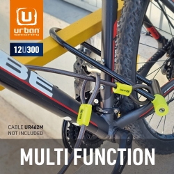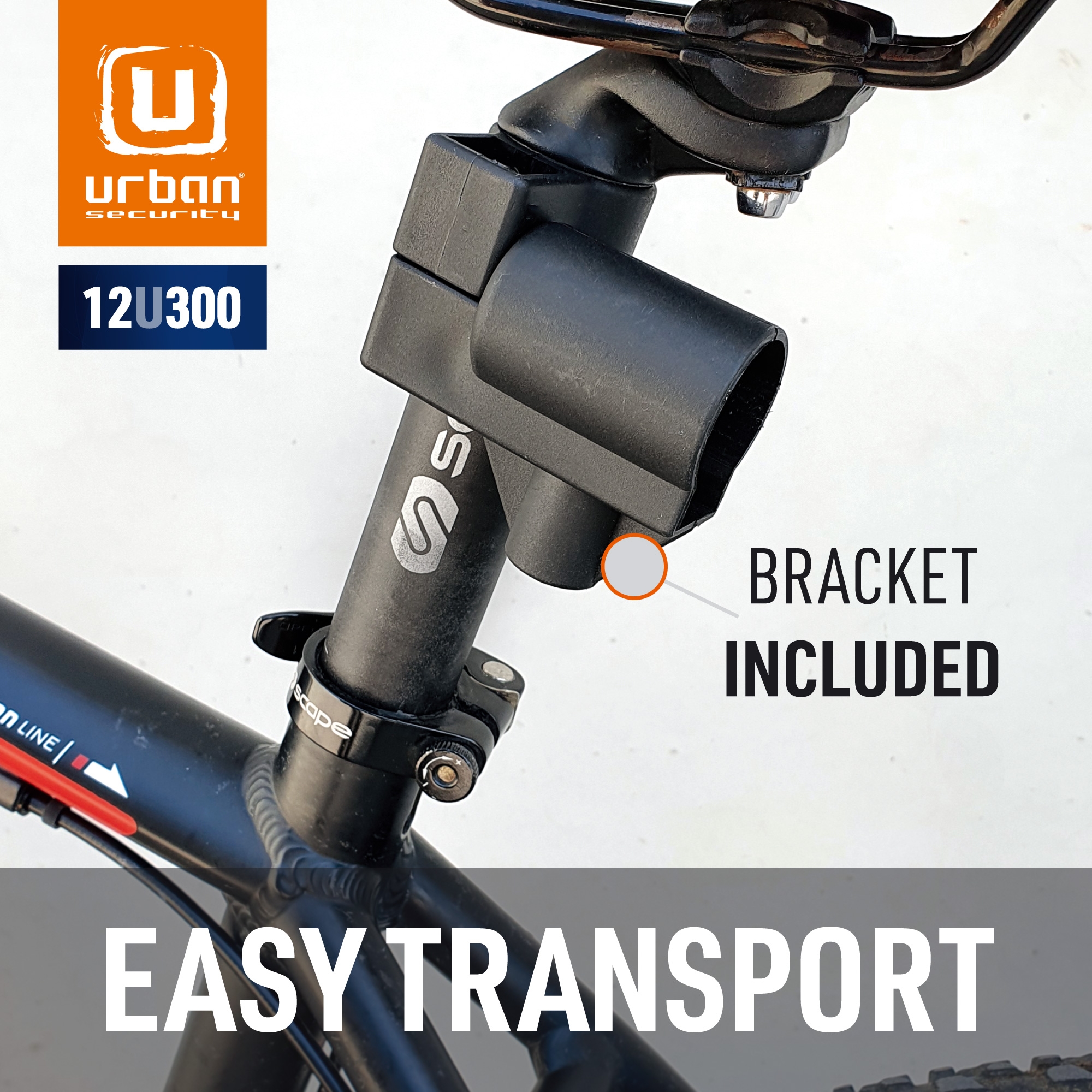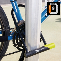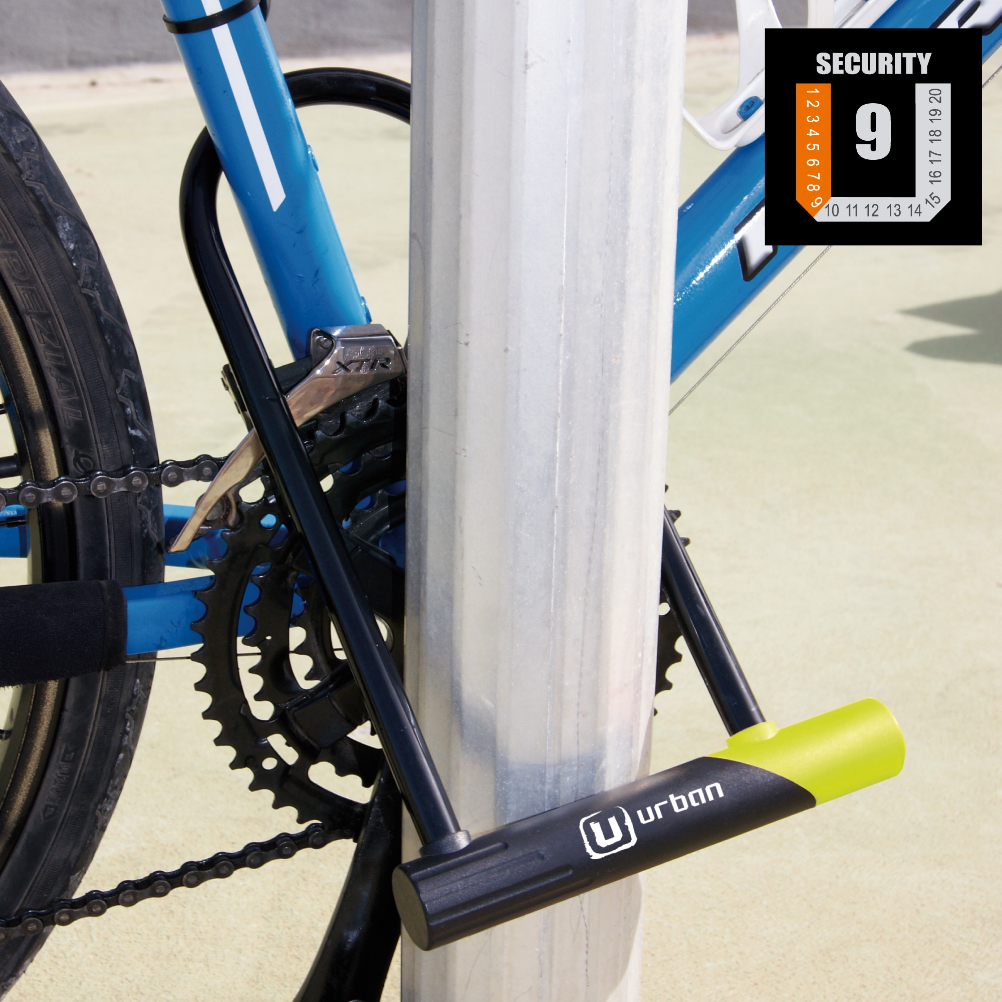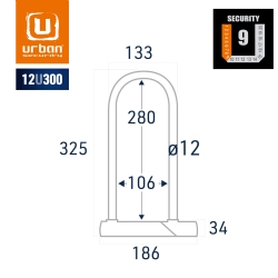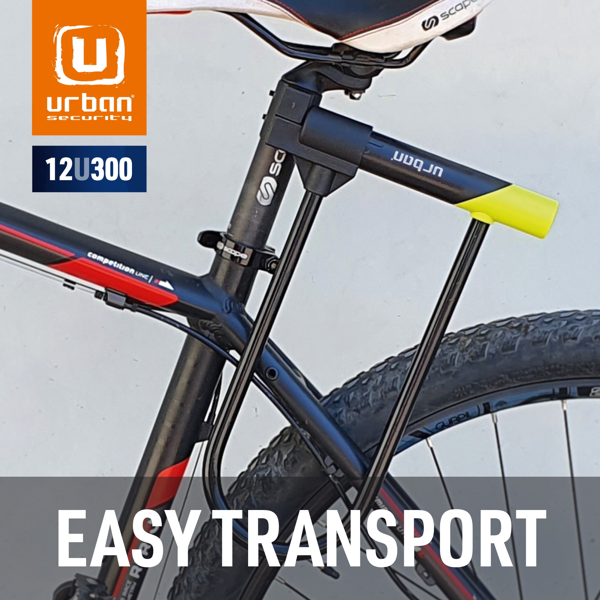 Antirrobo U Urban Security 12U300. El antirrobo de bicicleta Urban Security 12U300 ofrece ligereza, amplitud y una óptima seguridad. La anchura de horquilla es 106mm y cuenta con un diámetro de 12mm, destacando su altura de 280mm. Con estas amplias dimensiones se adapta a cualquier bicicleta, permitiendo anclarla a casi cualquier sitio. El mecanismo de cierre está blindado e incluye dos llaves. Lo puedes combinar con cualquiera de las cadenas de Urban Security. Incluye un soporte de regalo para que la lleves allí donde la necesites.