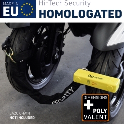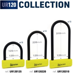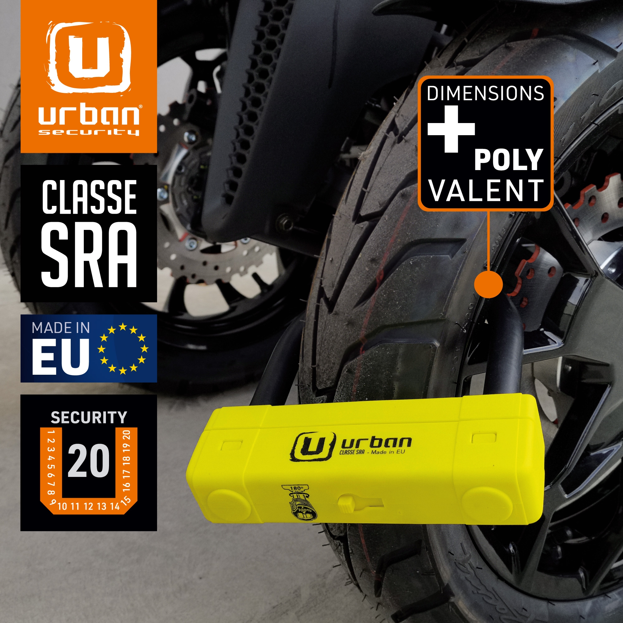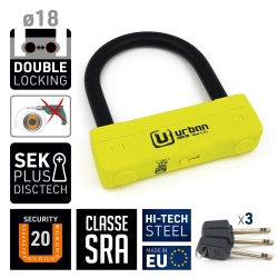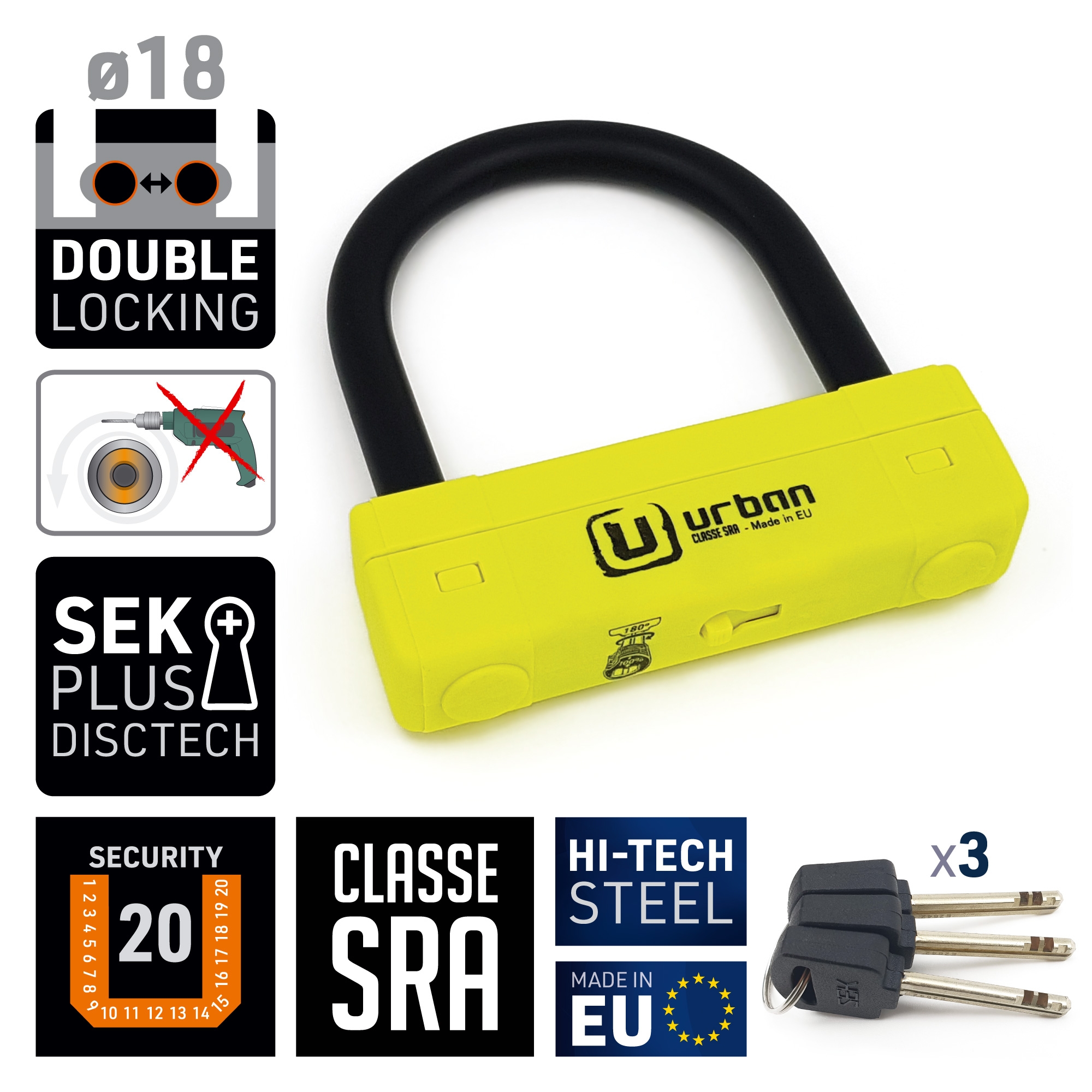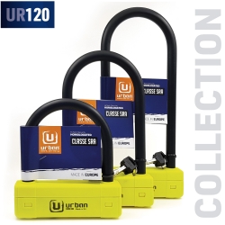 Antirrobo U Urban Security UR120125. Urban UR120 es el antirrobo de moto más resistente a los ataques de la gama Urban, con homologación SRA y Security Level 20. Fabricado con acero especial endurecido de máxima resistencia, el antirrobo Urban UR120 además va equipado con el cilindro de última generación SEK PLUS DISCTECH, que garantiza la protección más alta contra ganzúas y disco anti taladro de 2,5mm. El acero de la horquilla ha sido sometido a varios tratamientos para obtener el equilibrio perfecto entre dureza y flexibilidad, siendo testada contra sierra, cizalla, maza y palanca por los más exigentes laboratorios europeos independientes de certificación. El sistema de doble cierre permite bloquear la horquilla por sus dos puntas, aumentando hasta 2 veces su resistencia. El antirrobo Urban UR120 posee una anchura de horquilla de 120mm y un diámetro de 18mm y está disponible en 3 tamaños diferentes para para adaptarse a las necesidades de cada usuario. Urban recomienda su antirrobo UR120 para asegurar motos de alta gama en lugares con un alto riesgo de robo.