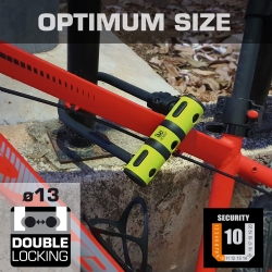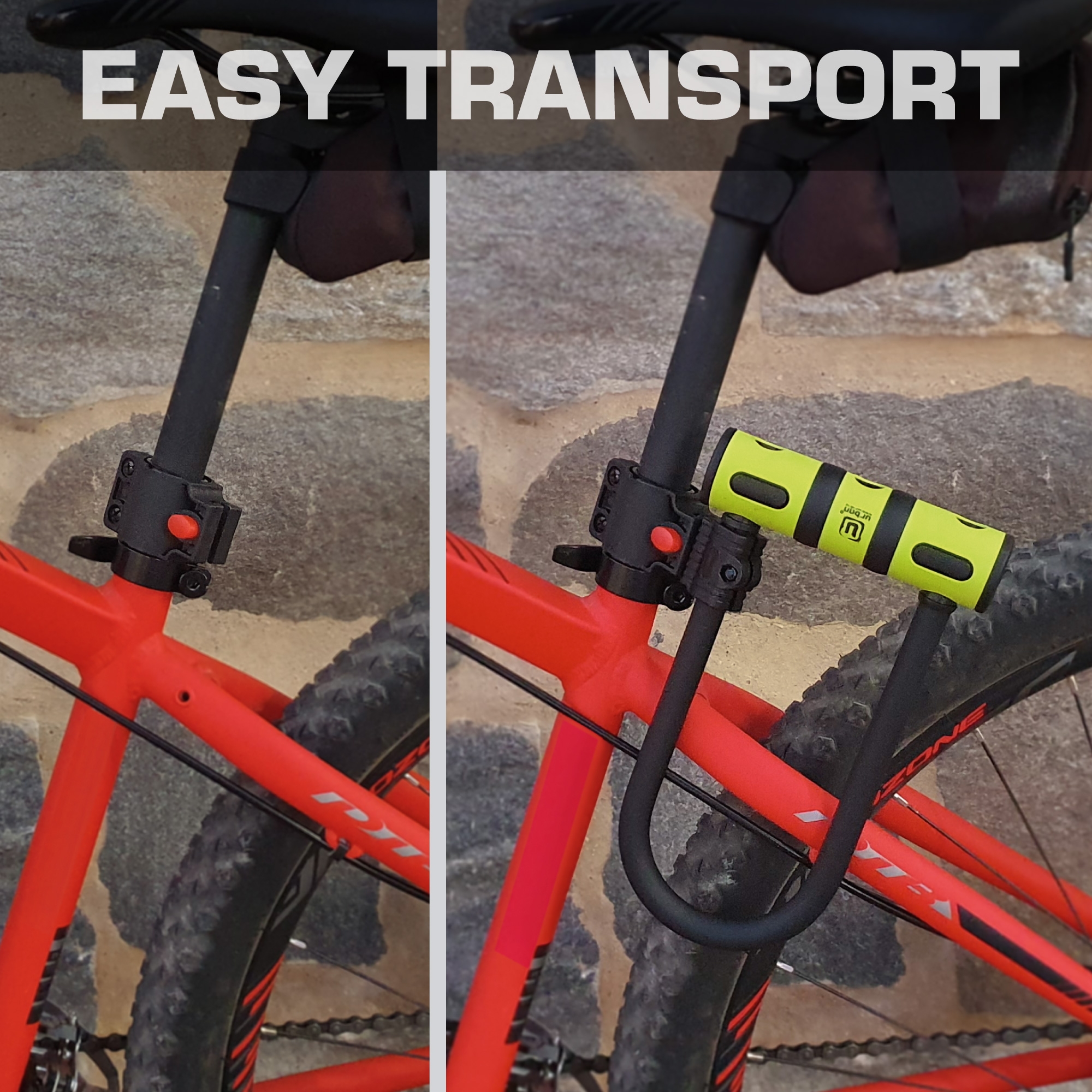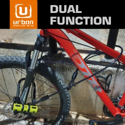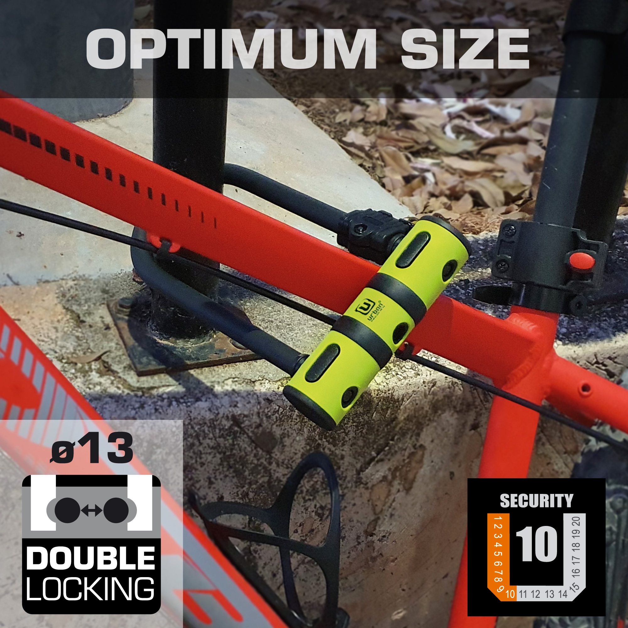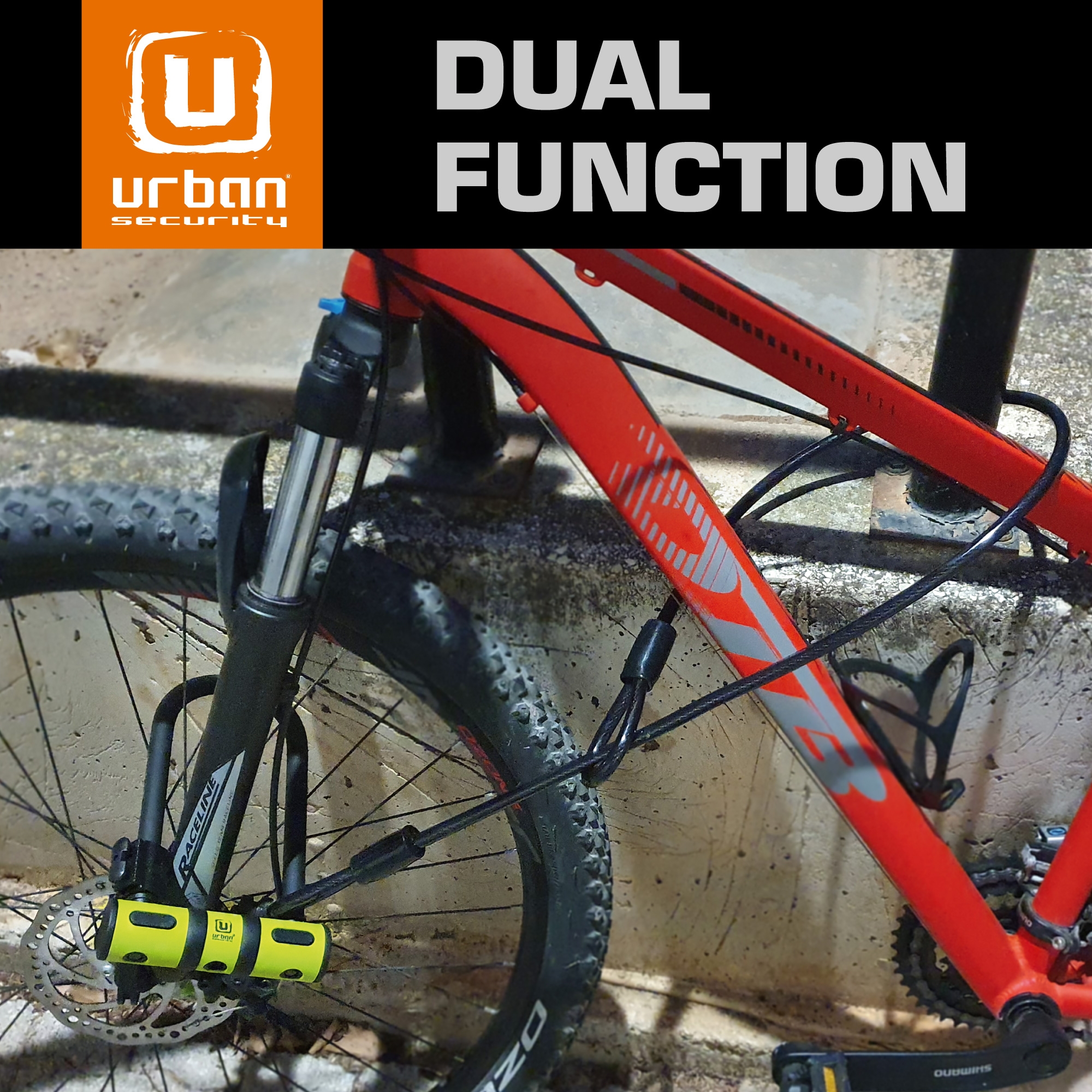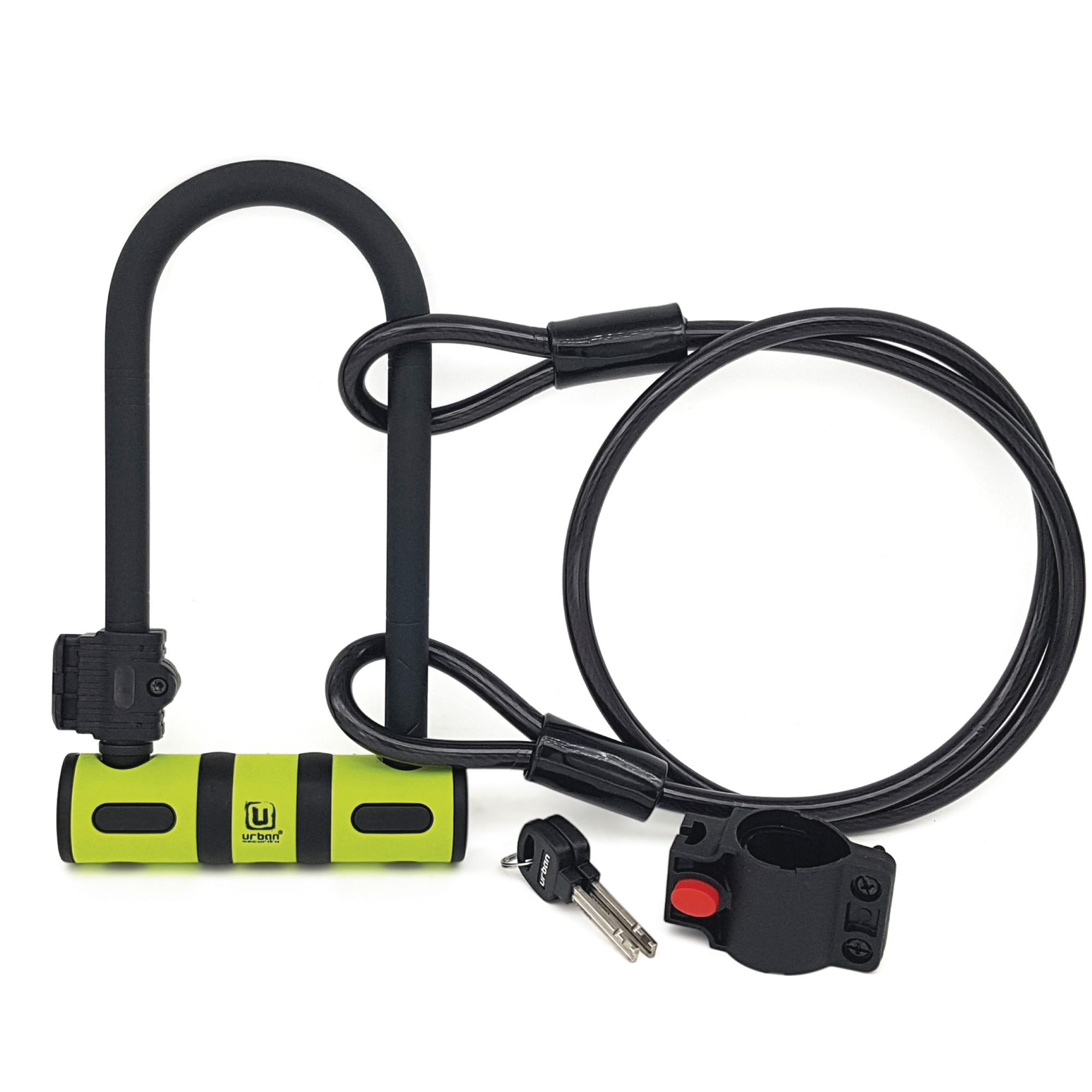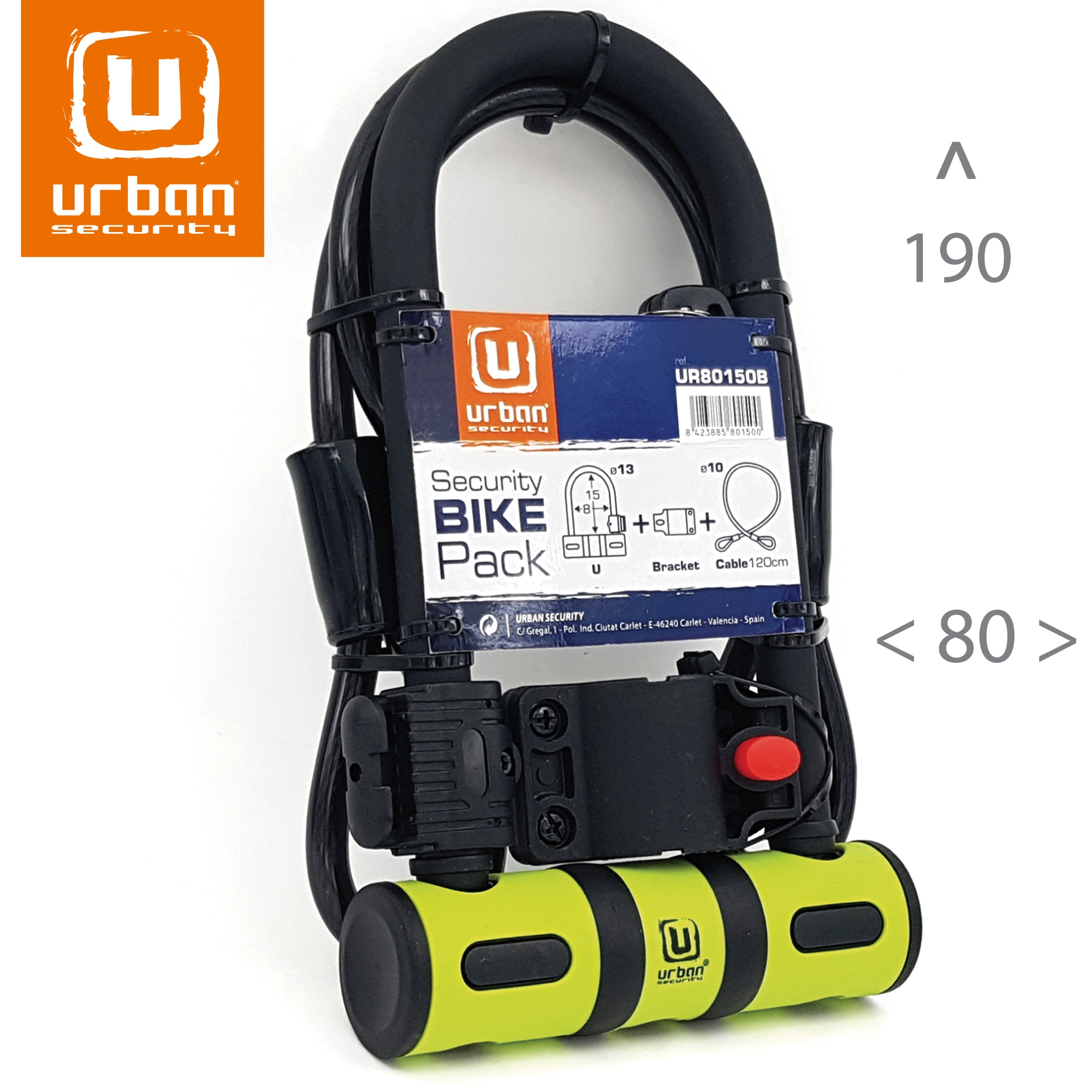 Antirrobo U Urban Security UR80150B. El antirrobo Urban Security UR80150B está especialmente diseñado para bicicletas. Se suministra con un soporte de regalo para que lo puedas transportar donde mejor se adapte y un polivalente cable de acero para que lo puedas atar a casi cualquier sitio. La U antirrobo tiene una anchura de horquilla de 80mm, un diámetro de 13mm y una altura de 190mm, con estas dimensiones se adapta a cualquier bicicleta y es ideal para que ancles tu bici a casi cualquier sitio. El mecanismo de cierre está blindado e incluye dos llaves. El antirrobo Urban Security UR80150B también se puede combinar con el resistente cable de acero que incluye el pack, un cable de 120cm de largo y diámetro 10, el accesorio perfecto para asegurar tu rueda delantera o para anclar tu bici a sitios en los que es imposible cerrar la U debido a su tamaño.