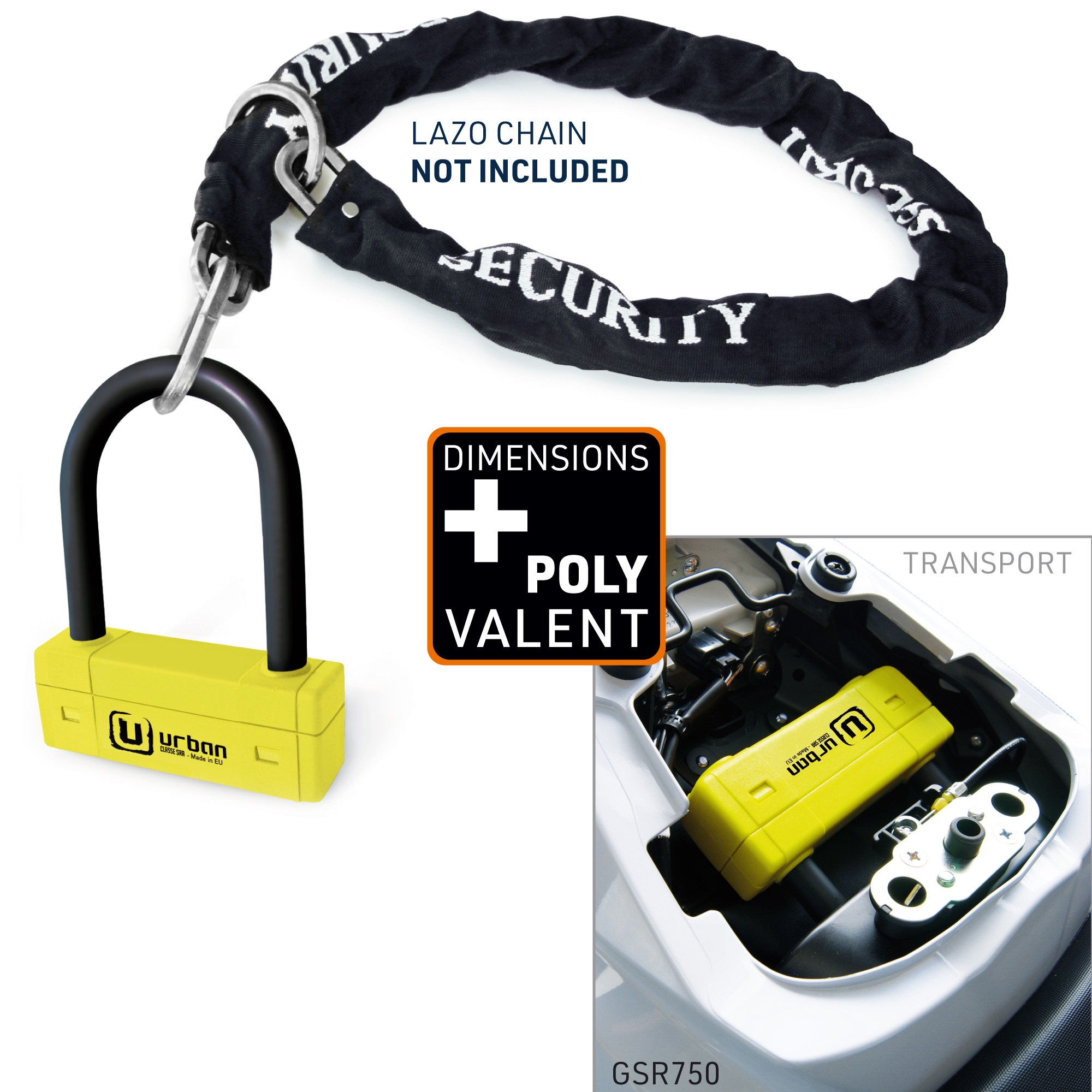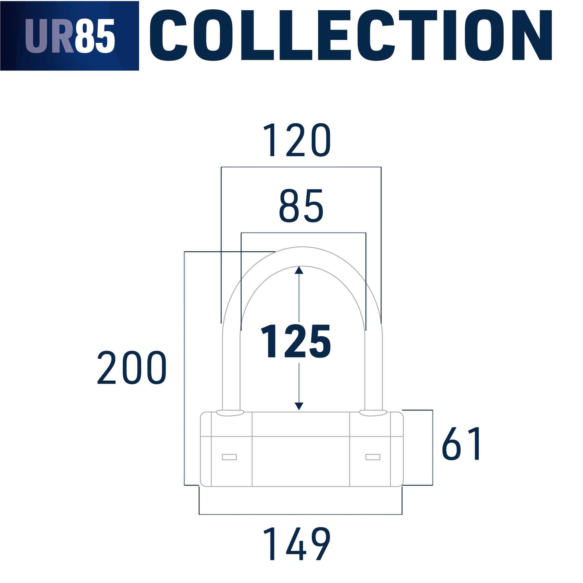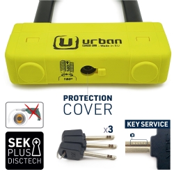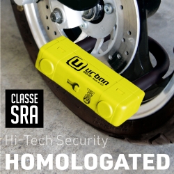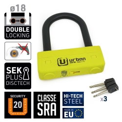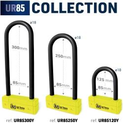 Antirrobo U Urban Security UR85120Y. Urban UR85 es junto al UR120, el antirrobo de moto más resistente a los ataques de la gama Urban. De hecho comparte toda la tecnología y los avances del UR120 y la única diferencia es su ancho, que en vez de ser de 120mm es de 85mm (además de la medida de largo). Fabricado con acero especial endurecido de máxima resistencia, el antirrobo Urban UR85 además va equipado con el cilindro de última generación SEK PLUS DISCTECH, que garantiza la protección más alta contra ganzúas y disco anti taladro de 2,5mm. El acero de la horquilla ha sido sometido a varios tratamientos para obtener el equilibrio perfecto entre dureza y flexibilidad, siendo testada contra sierra, cizalla, maza y palanca por los más exigentes laboratorios europeos independientes de certificación. El sistema de doble cierre permite bloquear la horquilla por sus dos puntas, aumentando hasta 2 veces su resistencia. El antirrobo Urban UR85 posee una anchura de horquilla de 85 mm y un diámetro de 18mm y está disponible en 3 tamaños diferentes para para adaptarse a las necesidades de cada usuario. Urban recomienda su antirrobo UR85 para asegurar motos de alta gama en lugares con un alto riesgo de robo.