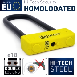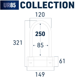 Antirrobo U Urban Security UR85250Y. Urban UR85 es junto al UR120, el antirrobo de moto más resistente a los ataques de la gama Urban. De hecho comparte toda la tecnología y los avances del UR120 y la única diferencia es su ancho, que en vez de ser de 120mm es de 85mm (además de la medida de largo). Fabricado con acero especial endurecido de máxima resistencia, el antirrobo Urban UR85 además va equipado con el cilindro de última generación SEK PLUS DISCTECH, que garantiza la protección más alta contra ganzúas y disco anti taladro de 2,5mm. El acero de la horquilla ha sido sometido a varios tratamientos para obtener el equilibrio perfecto entre dureza y flexibilidad, siendo testada contra sierra, cizalla, maza y palanca por los más exigentes laboratorios europeos independientes de certificación. El sistema de doble cierre permite bloquear la horquilla por sus dos puntas, aumentando hasta 2 veces su resistencia. El antirrobo Urban UR85 posee una anchura de horquilla de 85 mm y un diámetro de 18mm y está disponible en 3 tamaños diferentes para para adaptarse a las necesidades de cada usuario. Urban recomienda su antirrobo UR85 para asegurar motos de alta gama en lugares con un alto riesgo de robo.