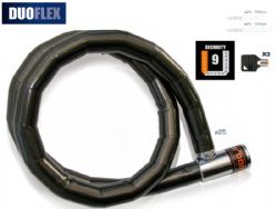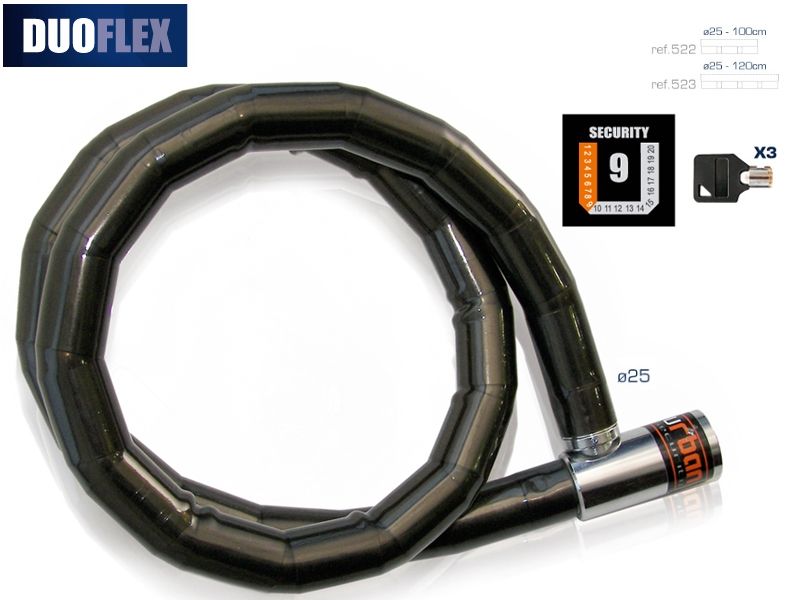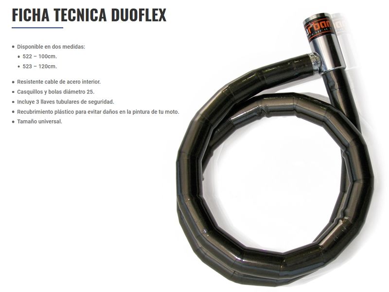 Antirrobo articulado Urban Security 522 Duoflex. El antirrobo para motos articulado Urban Duoflex ofrece ligereza, resistencia y flexibilidad, gracias a un resistente cable de acero que está protegido por casquillos y bolas de acero blindadas de diámetro 25mm, esto lo hace flexible pero resistente. El antirrobo está recubierto por una funda plástica para evitar daños en la pintura e incluye 3 llaves tubulares de seguridad. Con unas dimensiones totalmente universales, se puede utilizar en bicicletas, motos o scooters. El antirrobo Urban Duoflex está disponible en 2 medidas diferentes, la referencia 522 de 100cm y la 523 de 120cm.