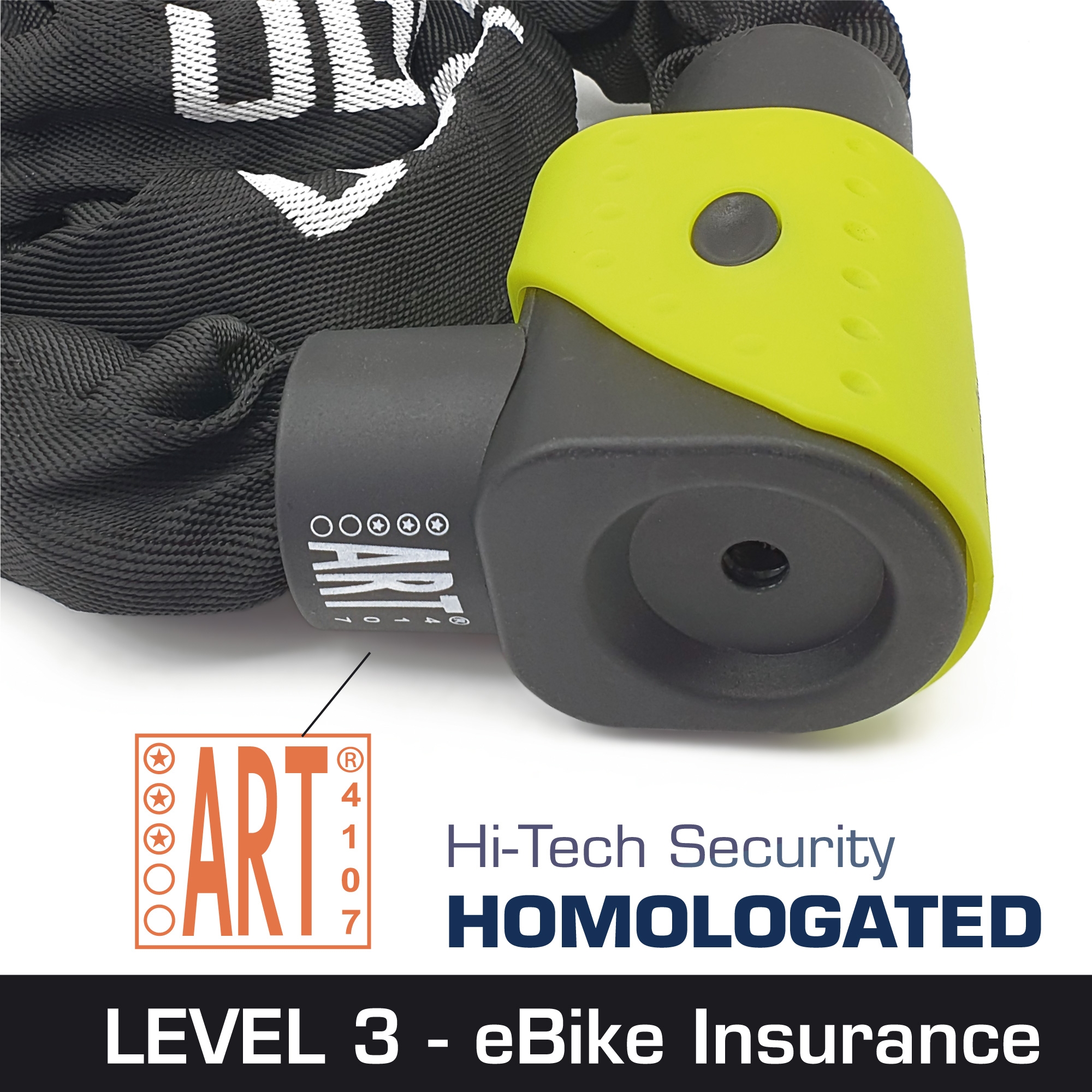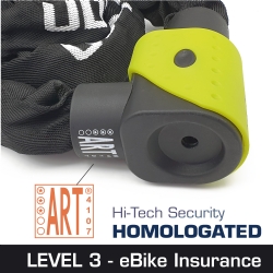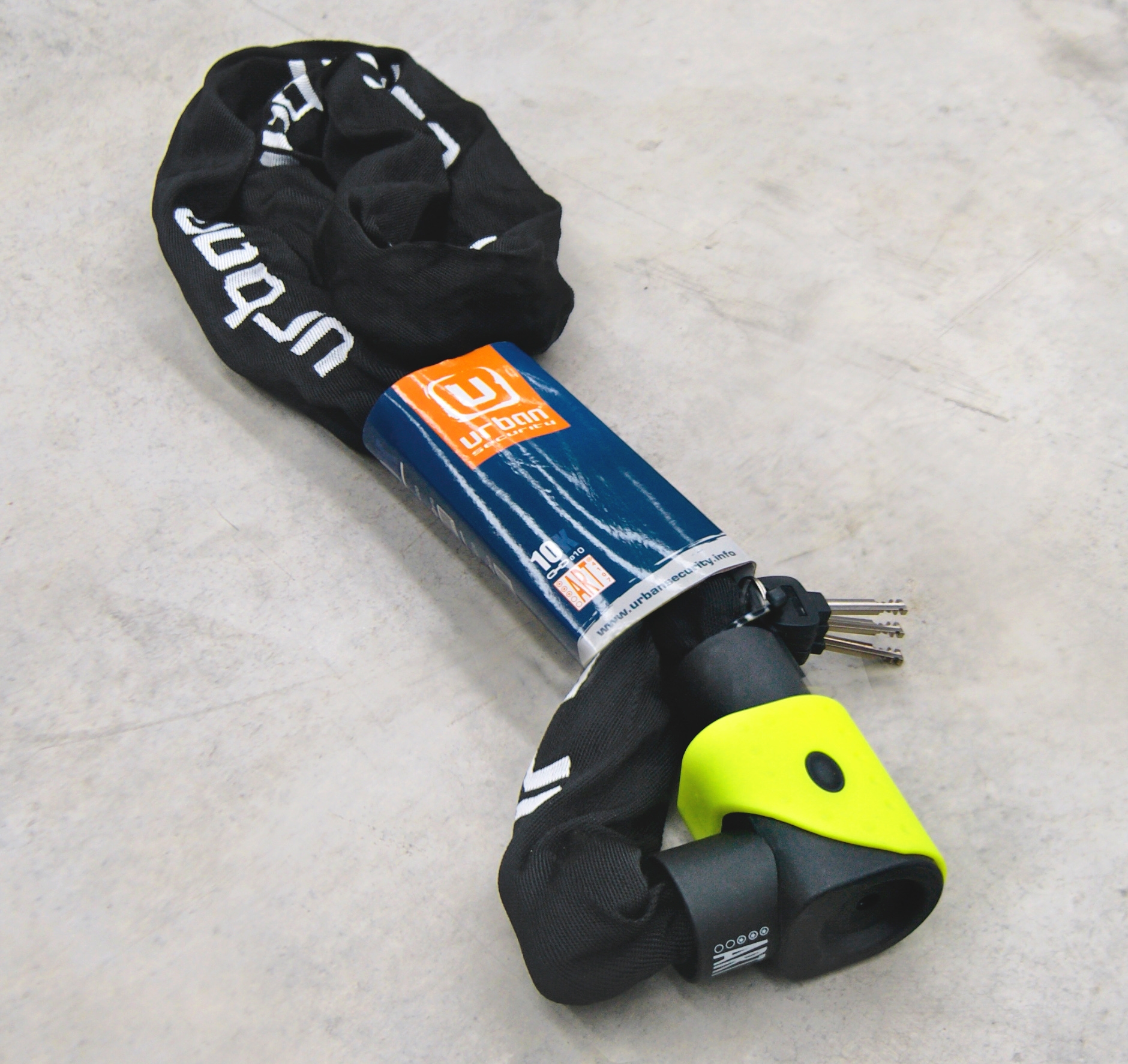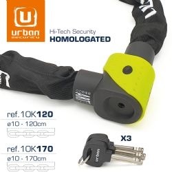 Antirrobo cadena Urban security 10K170. El antirrobo de cadena Urban Security 10K posee la homologación ART*** y se caracteriza por ser muy práctico en su uso. Esta especialmente diseñado para ofrecer seguridad a bicis, motos y scooters en zonas con un riesgo de robo bajo. Cuenta con eslabones de cadena de 10 mm de diámetro recubiertos por una funda textil para eviatr roces. Disponible en dos medidas, con unas dimensiones totalmente universales; 10K120 de 120cm y 10K170 de 170cm. Incluye dos llaves planas de seguridad.