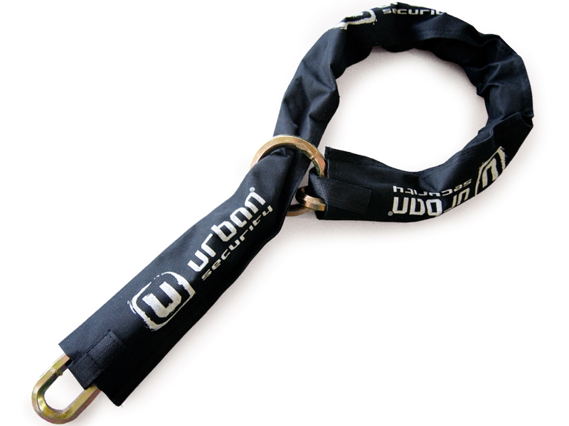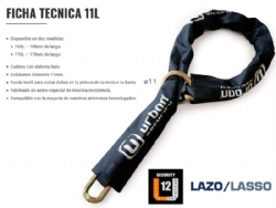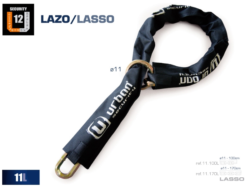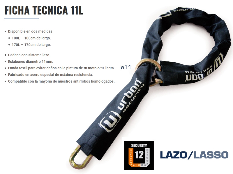 Antirrobo cadena Urban Security 11.100L. La cadena de lazo Urban 11L está formada por resistentes eslabones 11mm de diámetro fabricados en acero de máxima resistencia. Ningún tipo de cadena te ofrecerá tantas posibilidades de uso. La cadena lazo Urban Security 11L está disponible en varias medidas, la referencia 11.100L posee una longitud de 100cm y la referencia 11.170L una longitud de 170cm, ambas con sistema lazo. Están cubiertas por una funda textil de nylon para evitar daños en la pintura. La cadena con sistema lazo está diseñada con mucho ingenio porque puede ofrecer la seguridad de la cadena tradicional pero permite casi duplicar su tamaño y anclar la moto con extrema facilidad a casi cualquier sitio.