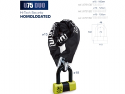 Antirrobo cadena Urban security U75150. Con el antirrobo de moto Urban U75 dispondrás de lo mejor en cadena y en antirrobo de disco para asegurar motos de alta gama en lugares con un alto riesgo de robo. El conjunto del U75 está formado por una cadena de acero de máxima resistencia con eslabones de 15mm de diámetro y la práctica Mini U U75 con un contundente arco de cierre de 18mm de diámetro. Este versátil antirrobo permite usarlo de diferentes formas; se puede utilizar el conjunto del antirrobo en el parking o alrededor de la cadena de la rueda trasera o usar sólo la Mini U U75 en el disco de freno delantero en la calle. En cualquiera de los casos dispondrás de alta seguridad. El conjunto del antirrobo Urban Security U75 posee la homologación CLASSE SRA, está fabricado en Europa y ha sido testado contra sierra, cizalla, maza, palanca, etc.. El Urban U75 está disponible en diferentes longitudes para adaptarse a tus necesidades; U75100 de 100cm, U75120 de 120cm y U75150 150cm.