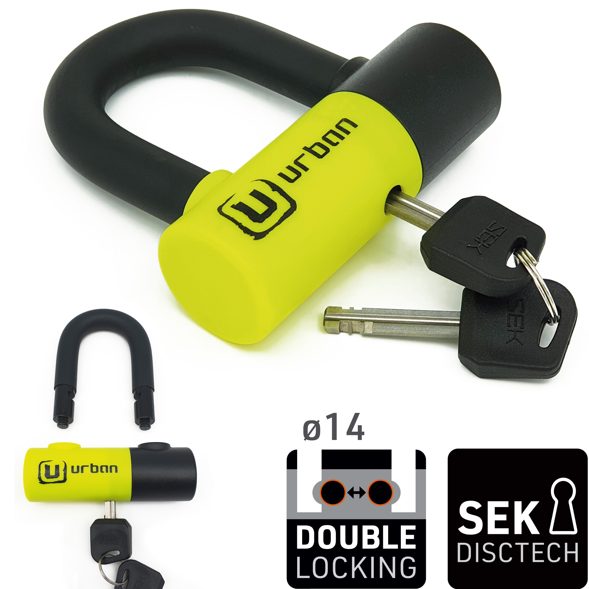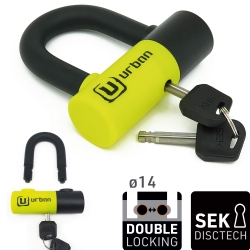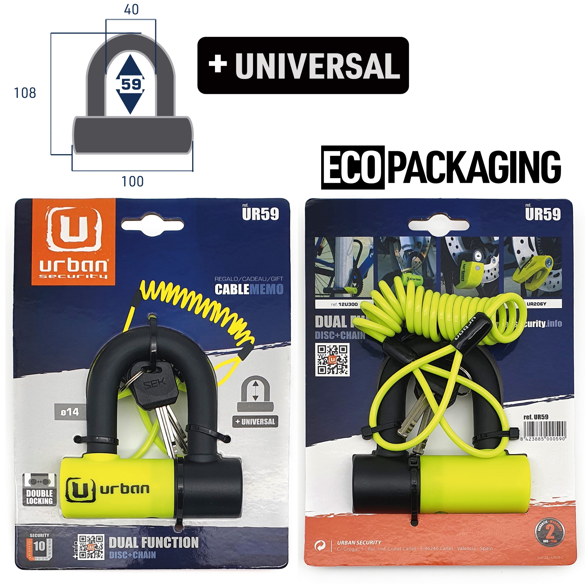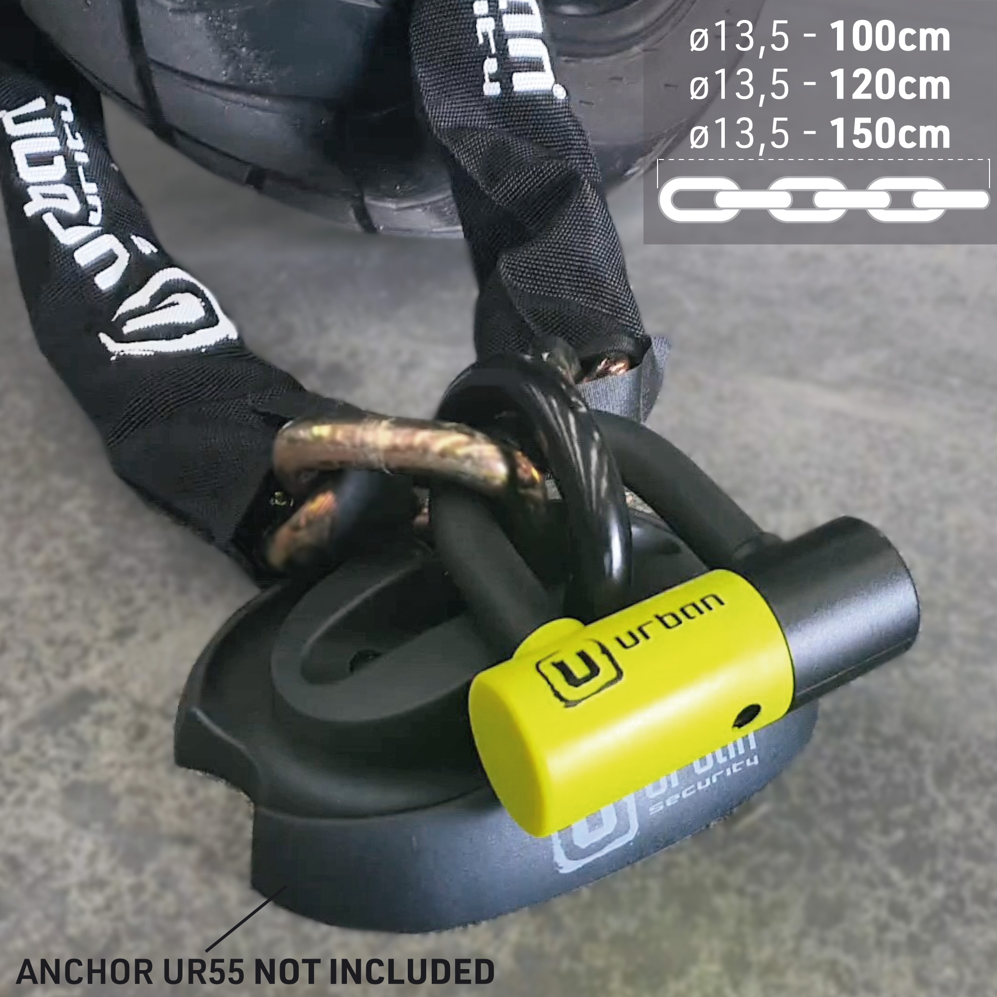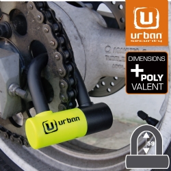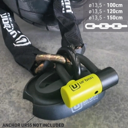 Antirrobo cadena Urban UR59K150. Nuevo antirrobo moto cadena Urban Security UR59K formado por una cadena de 13.5 mm de diámetro y el candado de Mini U UR59. Este producto se caracteriza por ser muy polivalente, ya que permite utilizar la U como antirrobo para el freno delantero, en la corona trasera, para combinarlo con la cadena de forma clásica o aprovecharte de su sistema lazo para anclar la moto un punto fijo. La cadena con sistema lazo está diseñada con mucho ingenio porque puede ofrecer la seguridad de la cadena tradicional pero permite casi duplicar su tamaño y anclar la moto con extrema facilidad a casi cualquier sitio. El candado Urban Mini U UR59K cuenta con un arco de cierre de 14 mm de diámetro muy resistente y sistema de doble cierre que bloquea la horquilla por sus dos puntas. La cerradura de discos anti-ganzúa que monta es realmente segura.