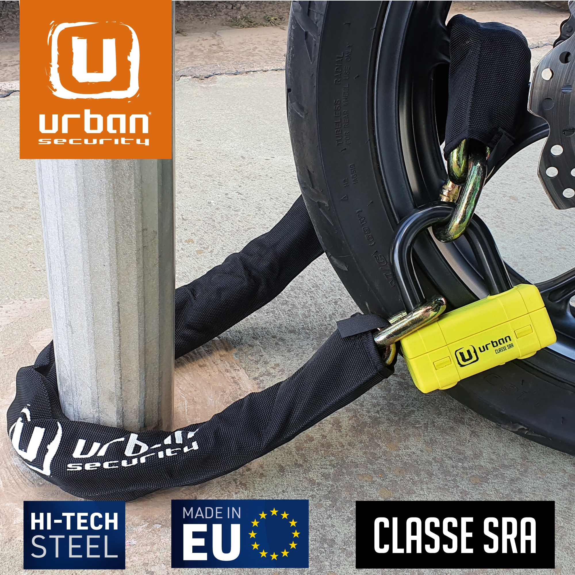 Antirrobo cadena Urban UR74120 UR74 Mini U. Con el nuevo antirrobo homologado de moto UR74 dispondrás prácticamente de la mejor cadena y antirrobo de disco que dispone el fabricante Urban Security. El conjunto del UR74 está formado por una cadena de acero de máxima resistencia con eslabones de diámetro 13,5 y una práctica Mini U con un resistente arco de cierre de 18mm de diámetro. Este polivalente antirrobo permite usdarlo de diferentes formas; se puede utilizar el conjunto del antirrobo en el parking o alrededor de la cadena de la rueda trasera o usar sólo la Mini U en el disco de freno delantero en la calle. En cualquiera de los casos dispondrás de alta seguridad. El antirrobo Urban Security UR74 posee la homologación CLASSE SRA, está fabricado en Europa y ha sido testado contra sierra, cizalla, maza, palanca, etc.. El Urban UR74 está disponible en diversas longitudes, 100cm, 120cm y 150cm, para adaptarse a tus necesidades.