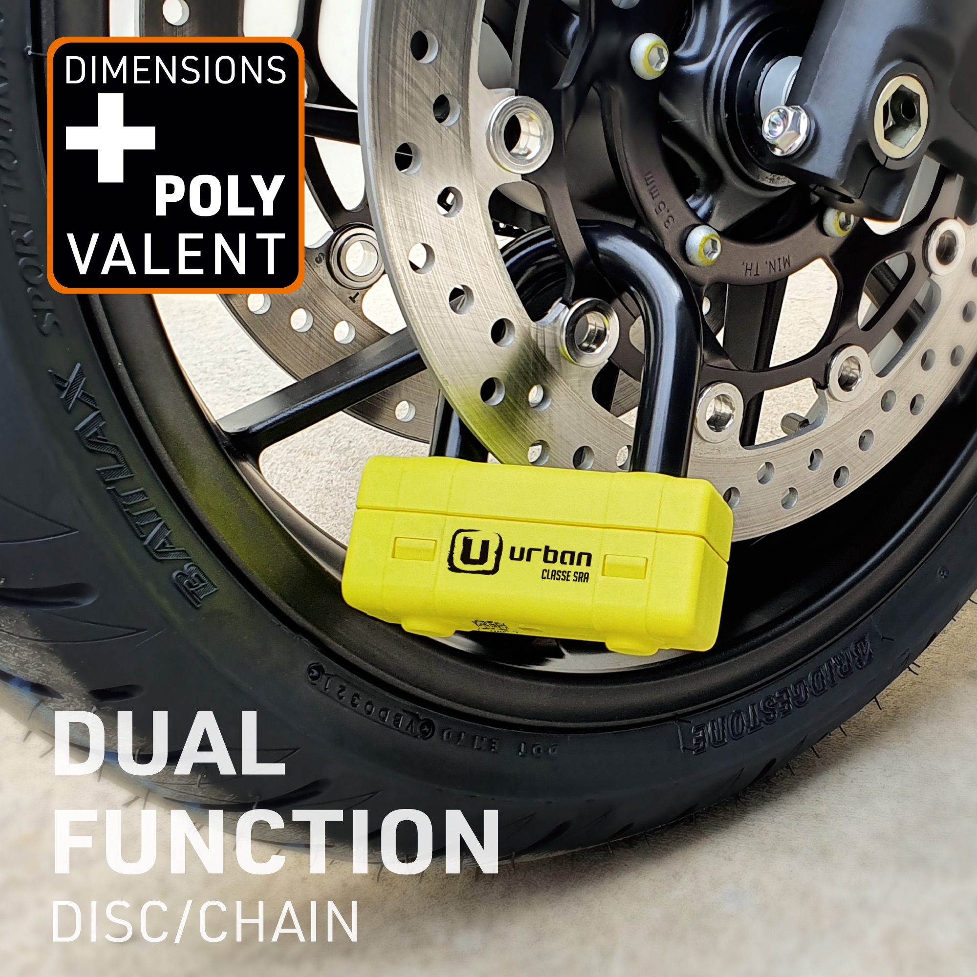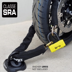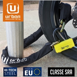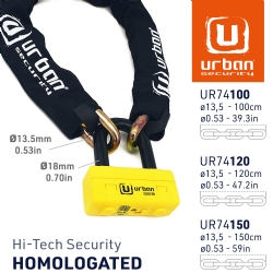 Antirrobo cadena Urban UR74150 UR74 Mini U. Con el nuevo antirrobo homologado de moto UR74 dispondrás prácticamente de la mejor cadena y antirrobo de disco que dispone el fabricante Urban Security. El conjunto del UR74 está formado por una cadena de acero de máxima resistencia con eslabones de diámetro 13,5 y una práctica Mini U con un resistente arco de cierre de 18mm de diámetro. Este polivalente antirrobo permite usdarlo de diferentes formas; se puede utilizar el conjunto del antirrobo en el parking o alrededor de la cadena de la rueda trasera o usar sólo la Mini U en el disco de freno delantero en la calle. En cualquiera de los casos dispondrás de alta seguridad. El antirrobo Urban Security UR74 posee la homologación CLASSE SRA, está fabricado en Europa y ha sido testado contra sierra, cizalla, maza, palanca, etc.. El Urban UR74 está disponible en diversas longitudes, 100cm, 120cm y 150cm, para adaptarse a tus necesidades.