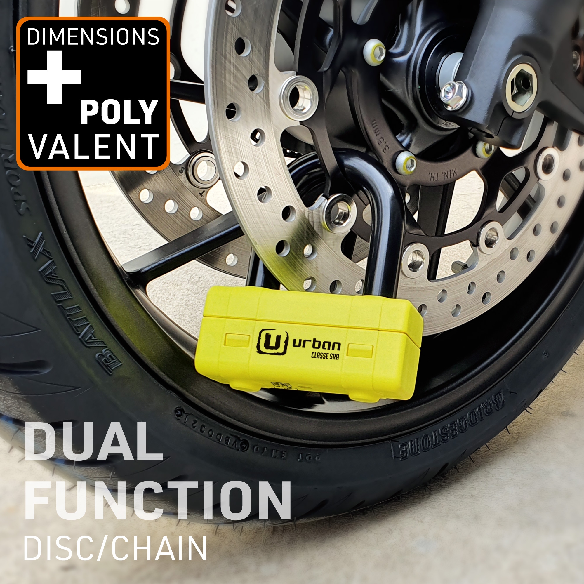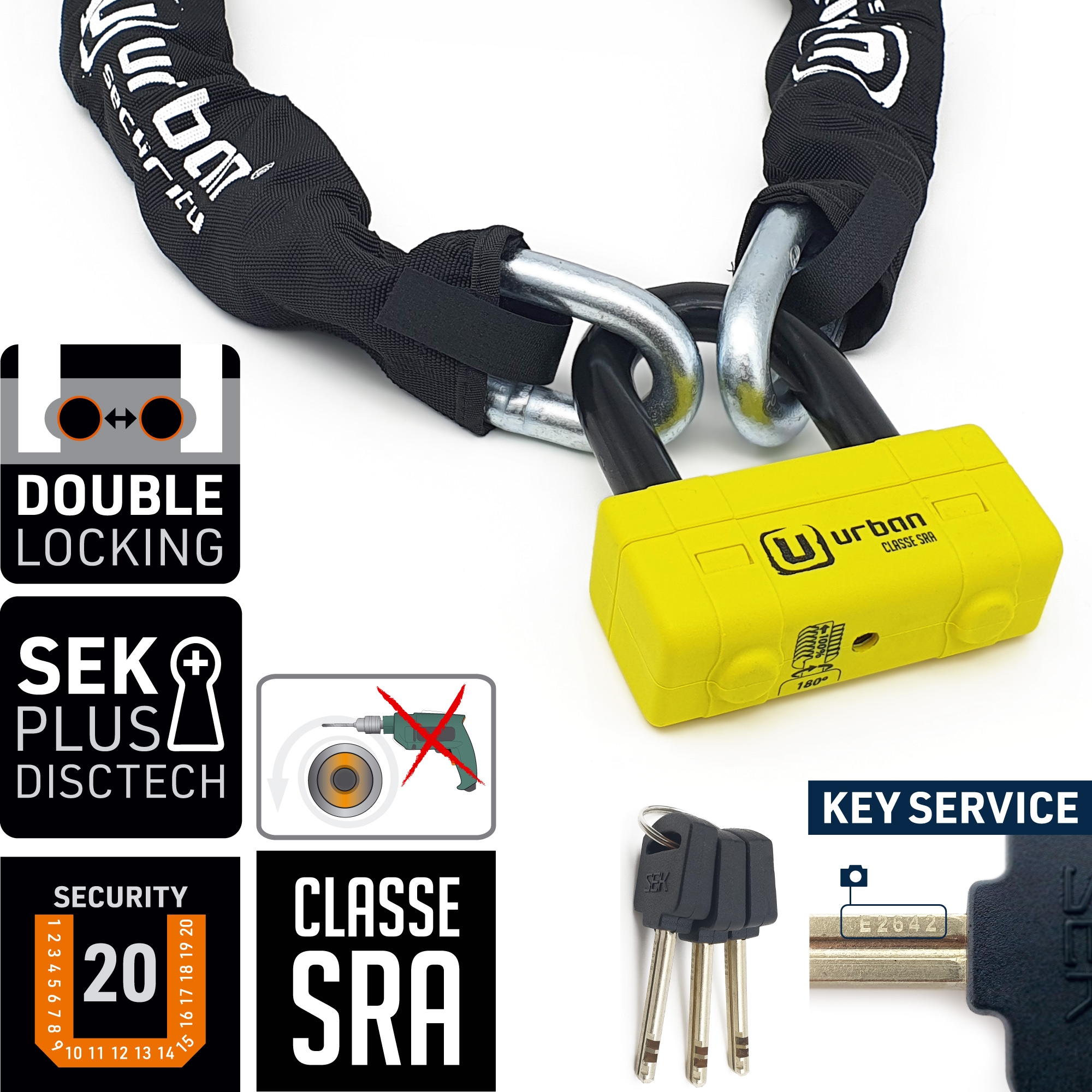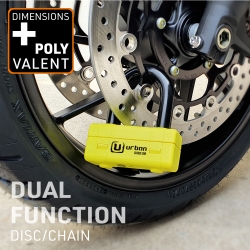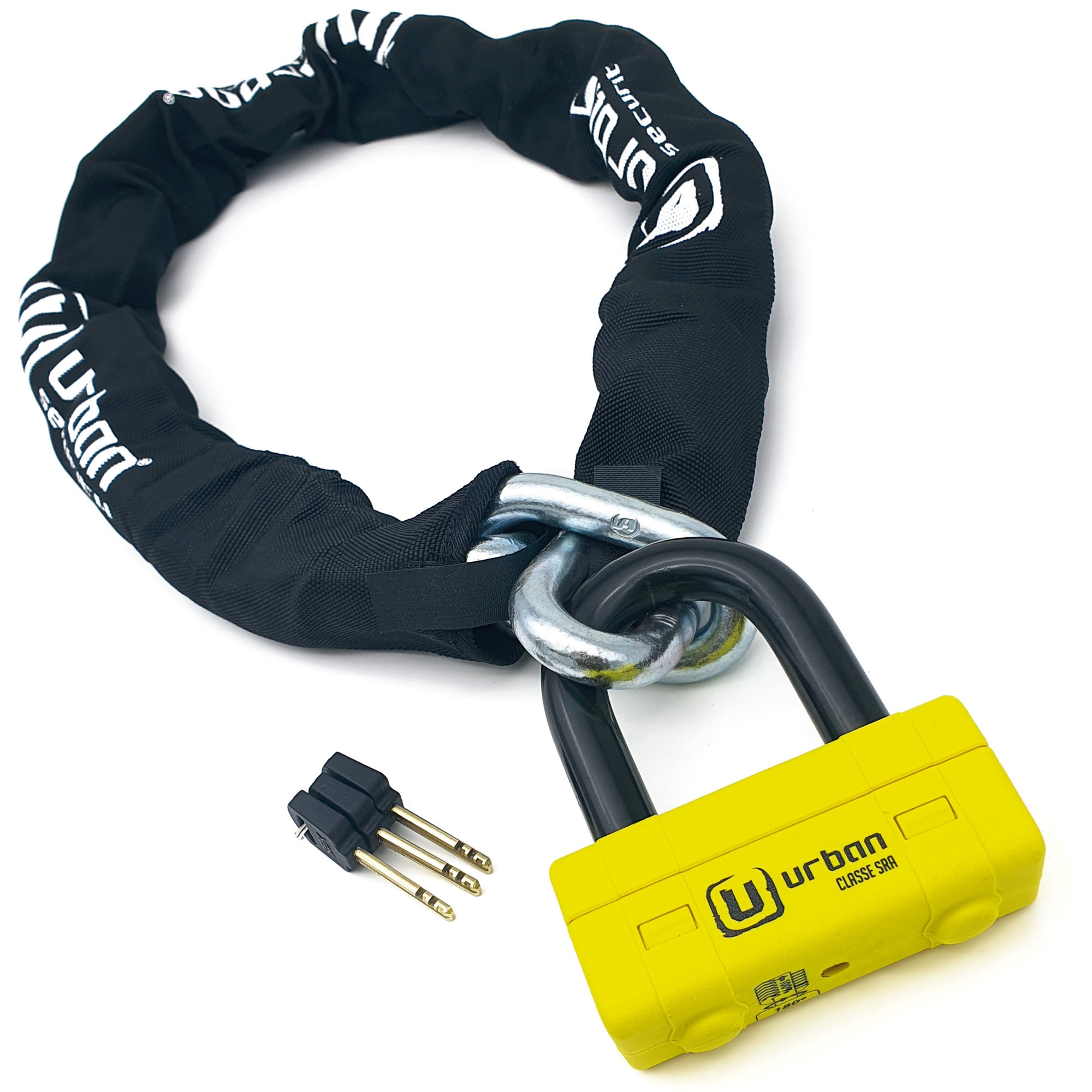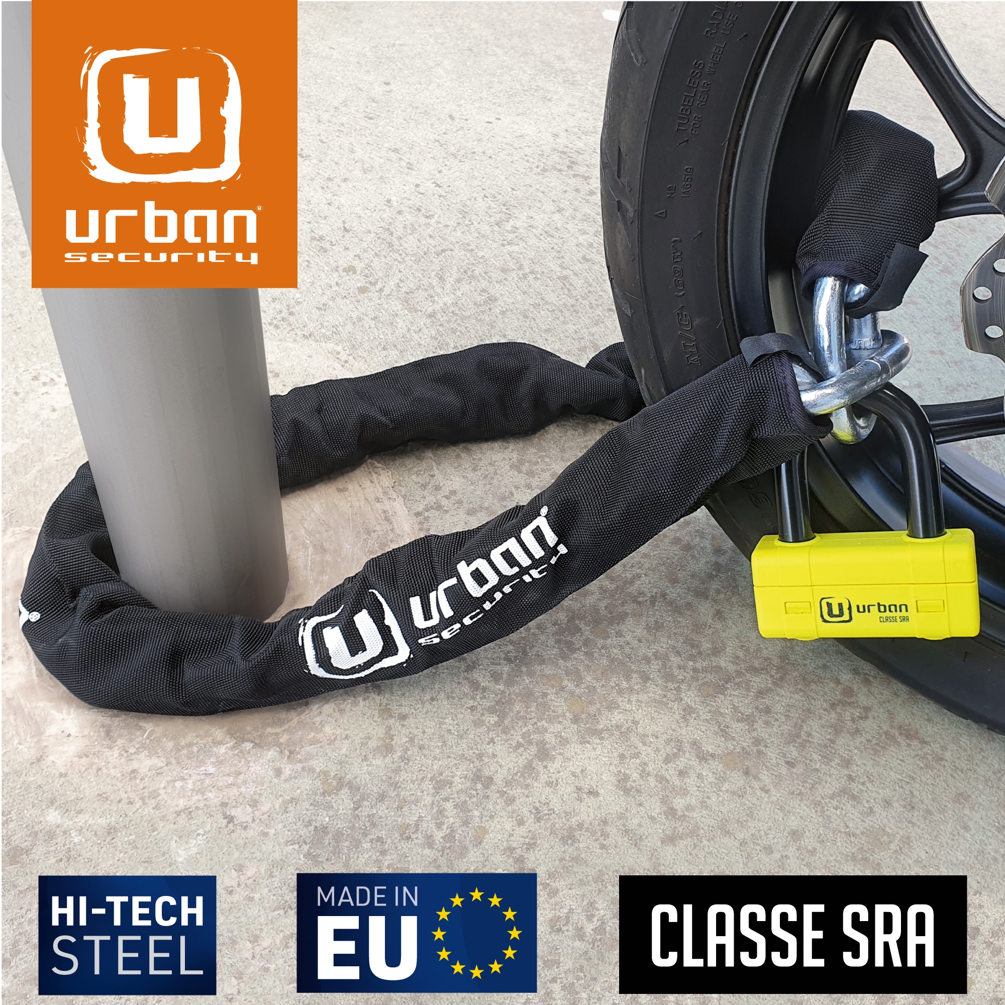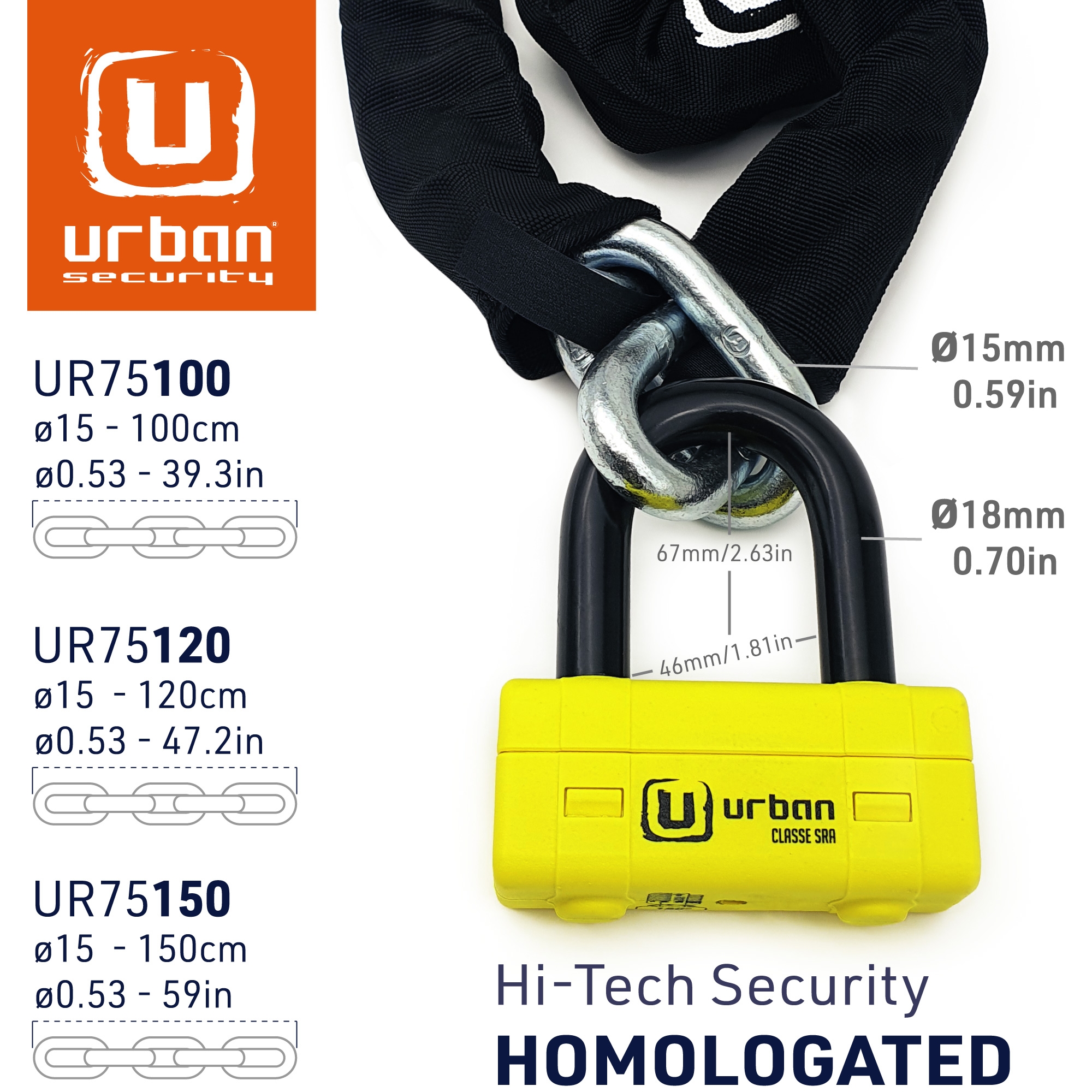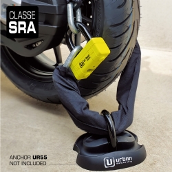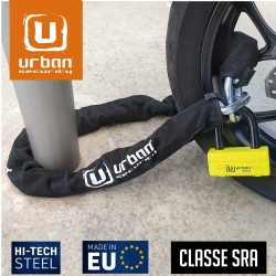 Antirrobo cadena Urban UR75100 UR75 Mini U. Con el antirrobo de moto Urban UR75 dispondrás de lo mejor en cadena y en antirrobo de disco para asegurar motos de alta gama en lugares con un alto riesgo de robo. El conjunto del UR75 está formado por una cadena de acero de máxima resistencia con eslabones de 15mm de diámetro y la práctica Mini U U75 con un contundente arco de cierre de 18mm de diámetro. Este versátil antirrobo permite usarlo de diferentes formas; se puede utilizar el conjunto del antirrobo en el parking o alrededor de la cadena de la rueda trasera o usar sólo la Mini U UR75 en el disco de freno delantero en la calle. En cualquiera de los casos dispondrás de alta seguridad. El conjunto del antirrobo Urban Security UR75 posee la homologación CLASSE SRA, está fabricado en Europa y ha sido testado contra sierra, cizalla, maza, palanca, etc.. El Urban UR75 está disponible en diferentes longitudes para adaptarse a tus necesidades; UR75100 de 100cm, UR75120 de 120cm y UR75150 150cm.