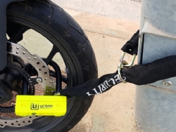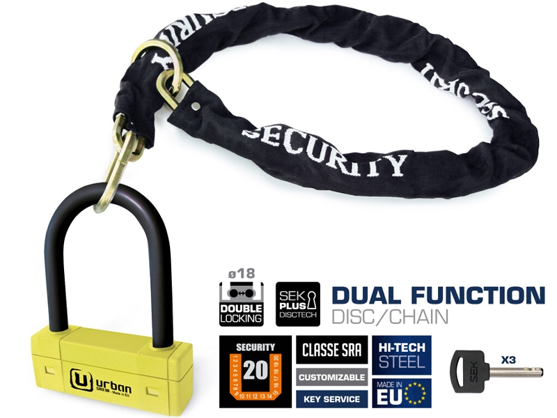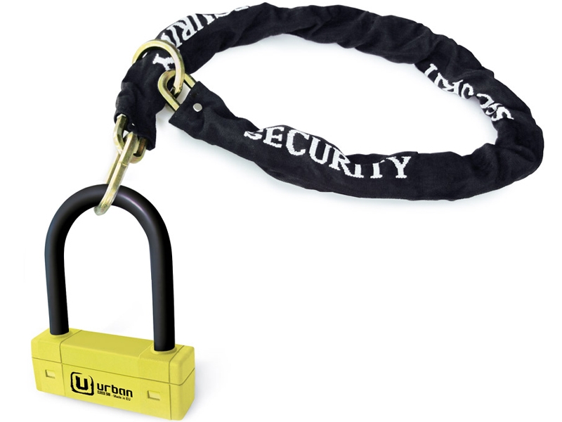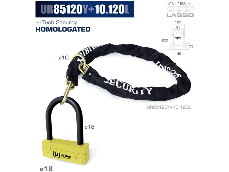 Antirrobo cadena Urban Security UR85120+10.120L. Antirrobo de alta seguridad y versatilidad formado por una cadena tipo lazo de 120cm y 10mm de diámetro y el candado de U homologado UR85120. Este producto ofrece diferentes posibilidades, ya que permite utilizar la U como antirrobo para el freno delantero, combinarlo con la cadena de forma clásica o aprovecharte de su sistema lazo para anclar tu moto un punto fijo. La cadena con sistema lazo está diseñada con mucho ingenio porque puede ofrecer la seguridad de la cadena tradicional pero permite casi duplicar su tamaño y anclar la moto con extrema facilidad a casi cualquier sitio. El candado Urban UR85120Y también es un producto de alta calidad y es sin lugar a dudas el producto más resistente a cualquier tipo de ataque. Dispone de una anchura de horquilla de 85mm y un diámetro de 18mm. El antirrobo de cadena Urban Security UR85120+10.120L está homologado (CLASSE SRA) y fabricado en Europa.