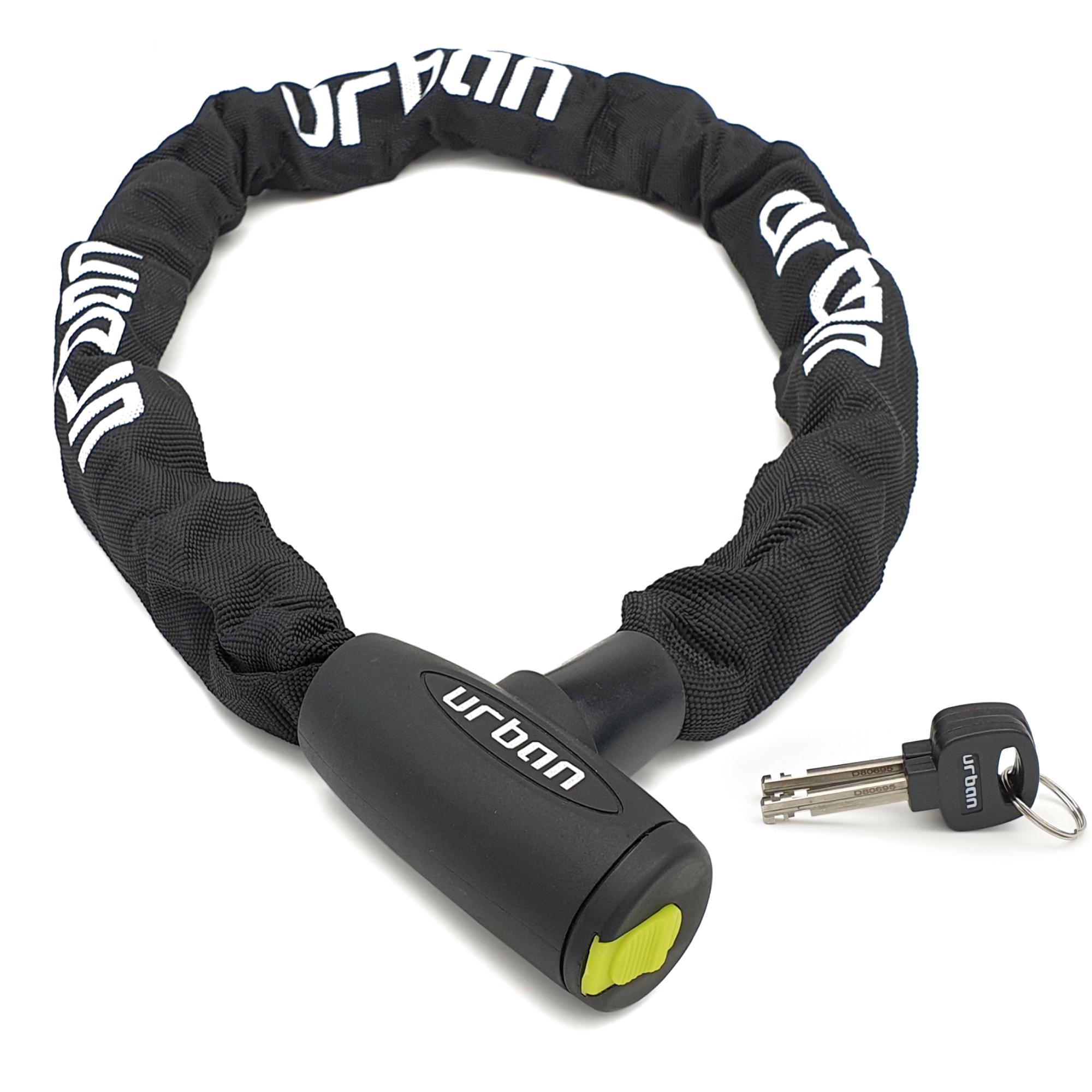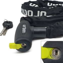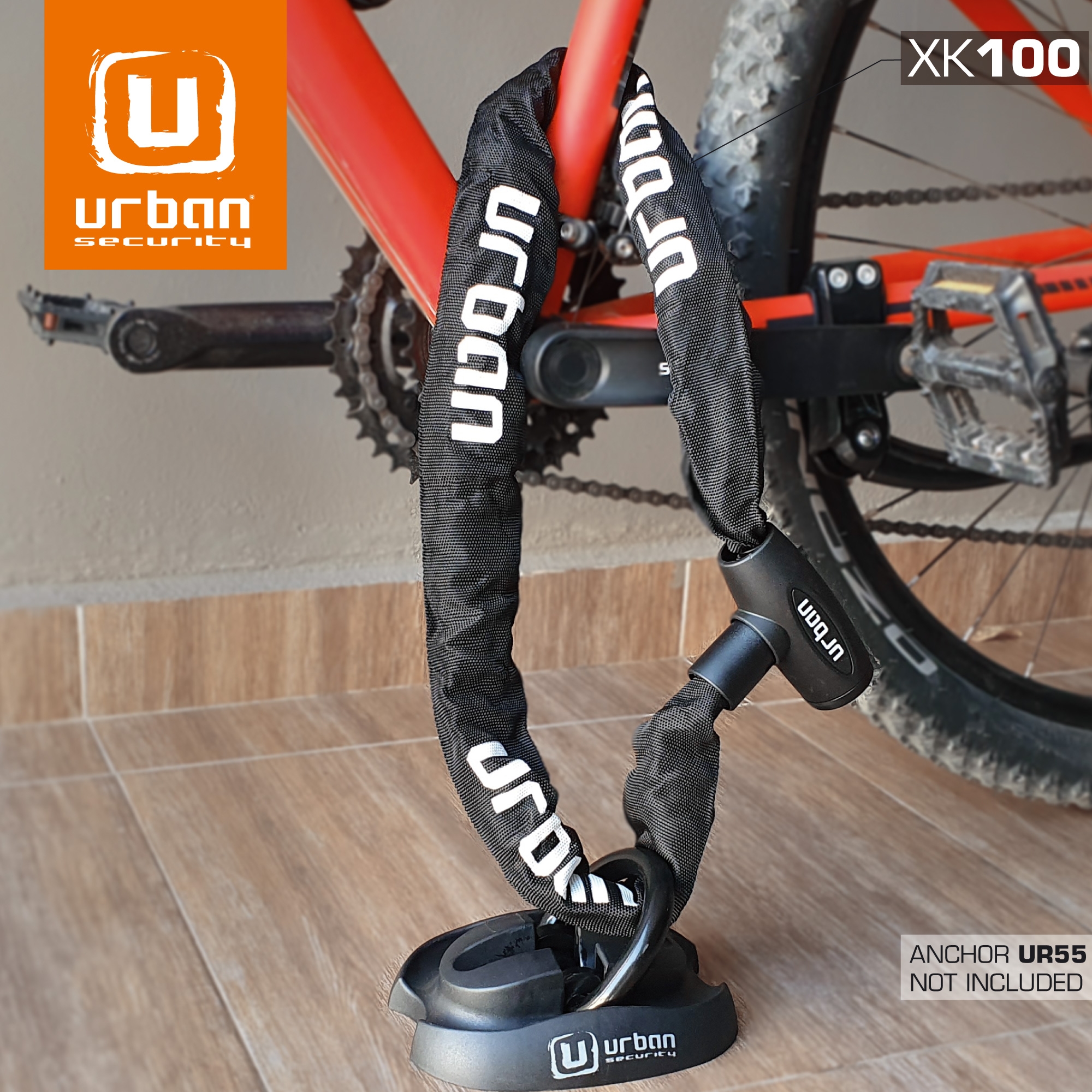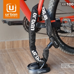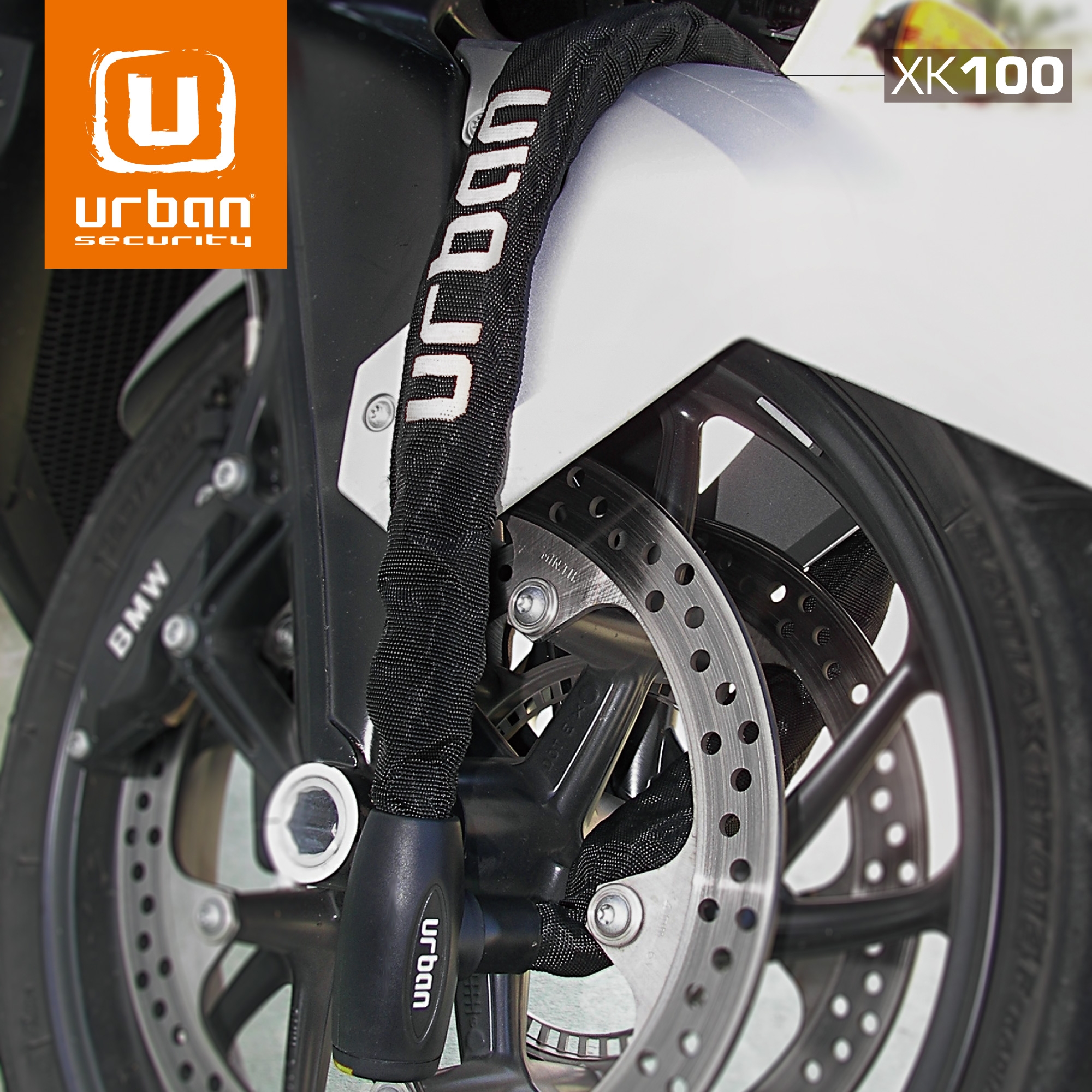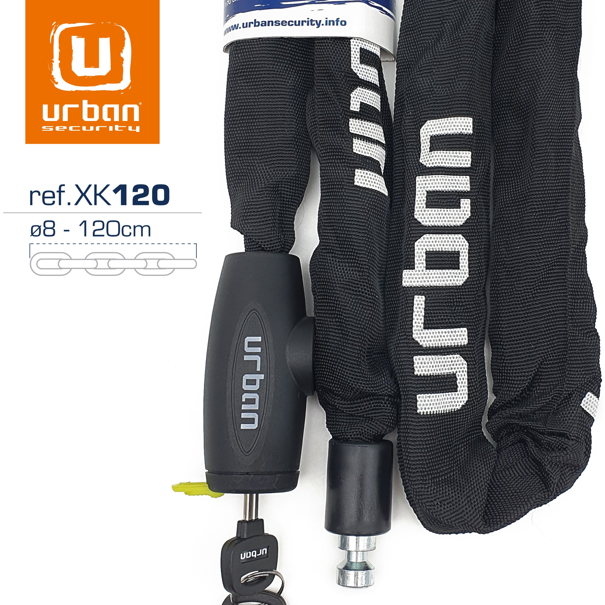 Antirrobo cadena Urban security XK120. El anntirrobo de cadena Urban XK se caracteriza por se ligereza, polivalencia y facilidad para transportarla, siendo ideal para utilizar tanto en moto, bici como en scooter en lugares con un riesgo de robo bajo. La cadena Urban Security XK cuenta con eslabones de sección cuadrada con diámetro de 8mm que han sido recubiertos por una funda textil para minimizar los daños causados por el roce. Esta cadena cuenta con una práctica tapa en la cerradura que evita la entrada del polvo y la formación de corrosión para mayor durabilidad. Incluye 2 llaves planas de seguridad y está disponible en tres medidas; XK100 de 100cm, XK120 de 120cm y XK170 de 170cm, dependiendo de las necesidades de cada usuario.