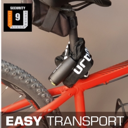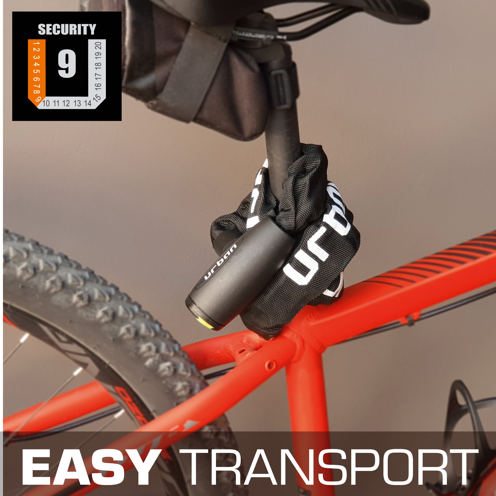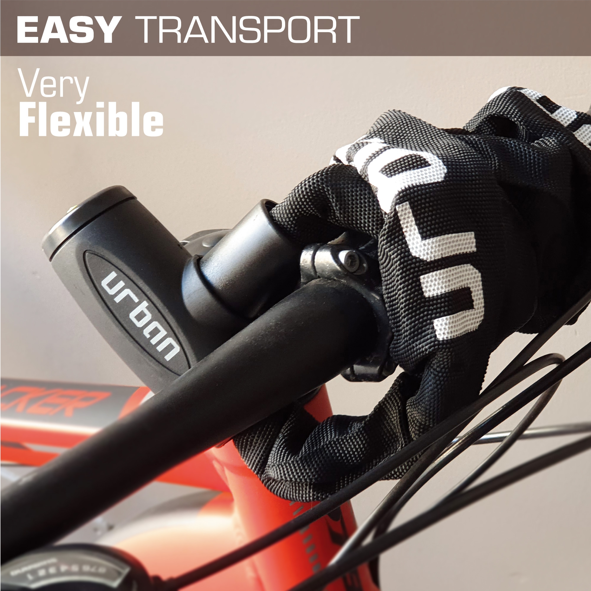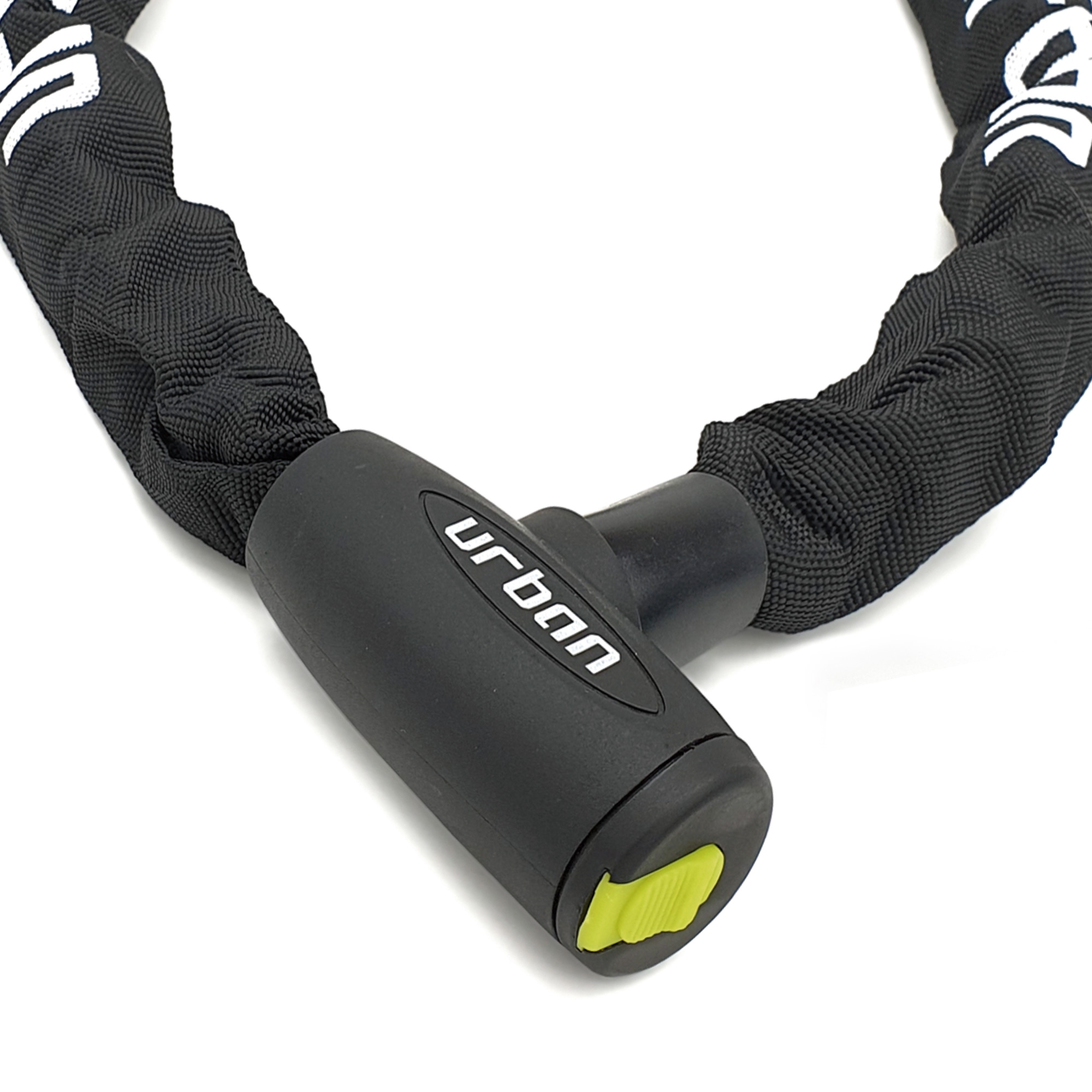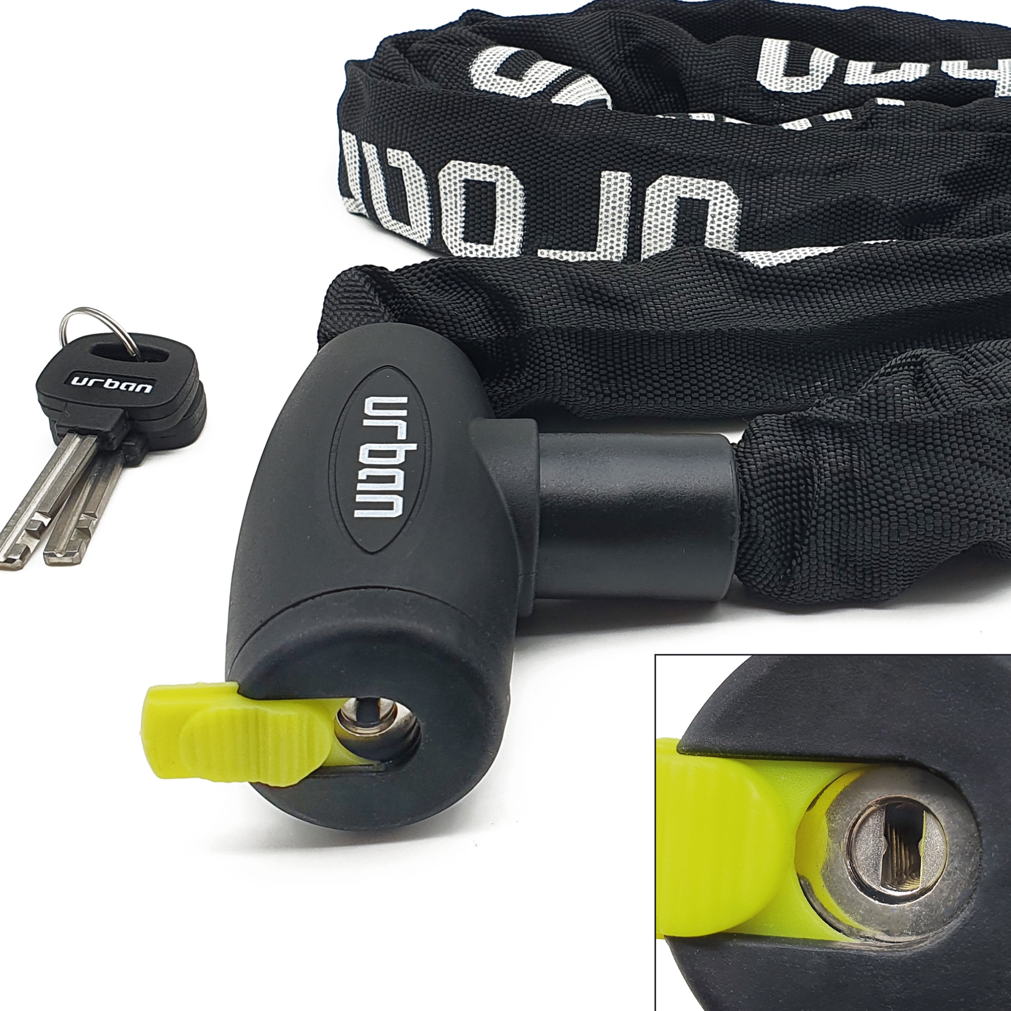 Antirrobo cadena Urban security XK120. El anntirrobo de cadena Urban XK se caracteriza por se ligereza, polivalencia y facilidad para transportarla, siendo ideal para utilizar tanto en moto, bici como en scooter en lugares con un riesgo de robo bajo. La cadena Urban Security XK cuenta con eslabones de sección cuadrada con diámetro de 8mm que han sido recubiertos por una funda textil para minimizar los daños causados por el roce. Esta cadena cuenta con una práctica tapa en la cerradura que evita la entrada del polvo y la formación de corrosión para mayor durabilidad. Incluye 2 llaves planas de seguridad y está disponible en tres medidas; XK100 de 100cm, XK120 de 120cm y XK170 de 170cm, dependiendo de las necesidades de cada usuario.