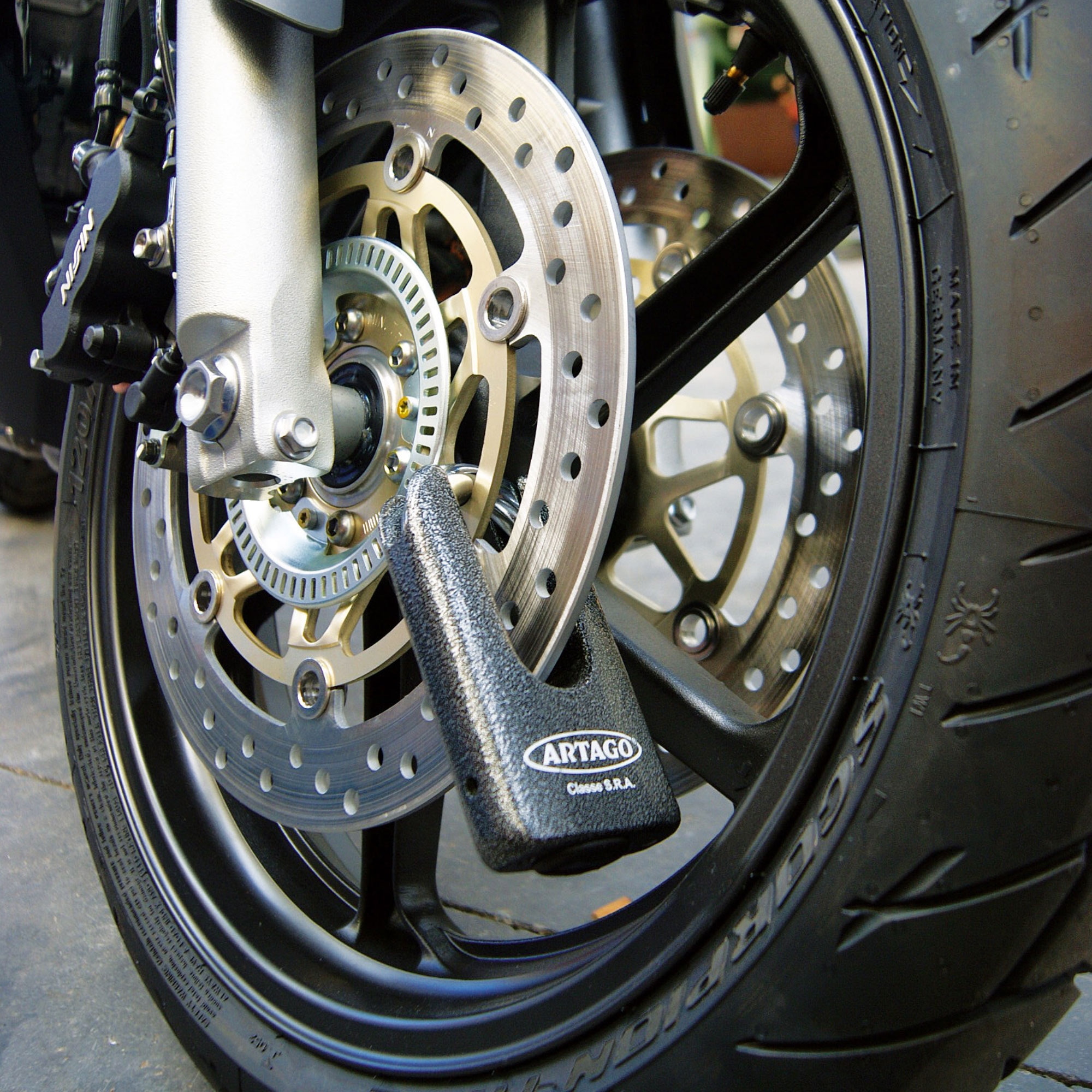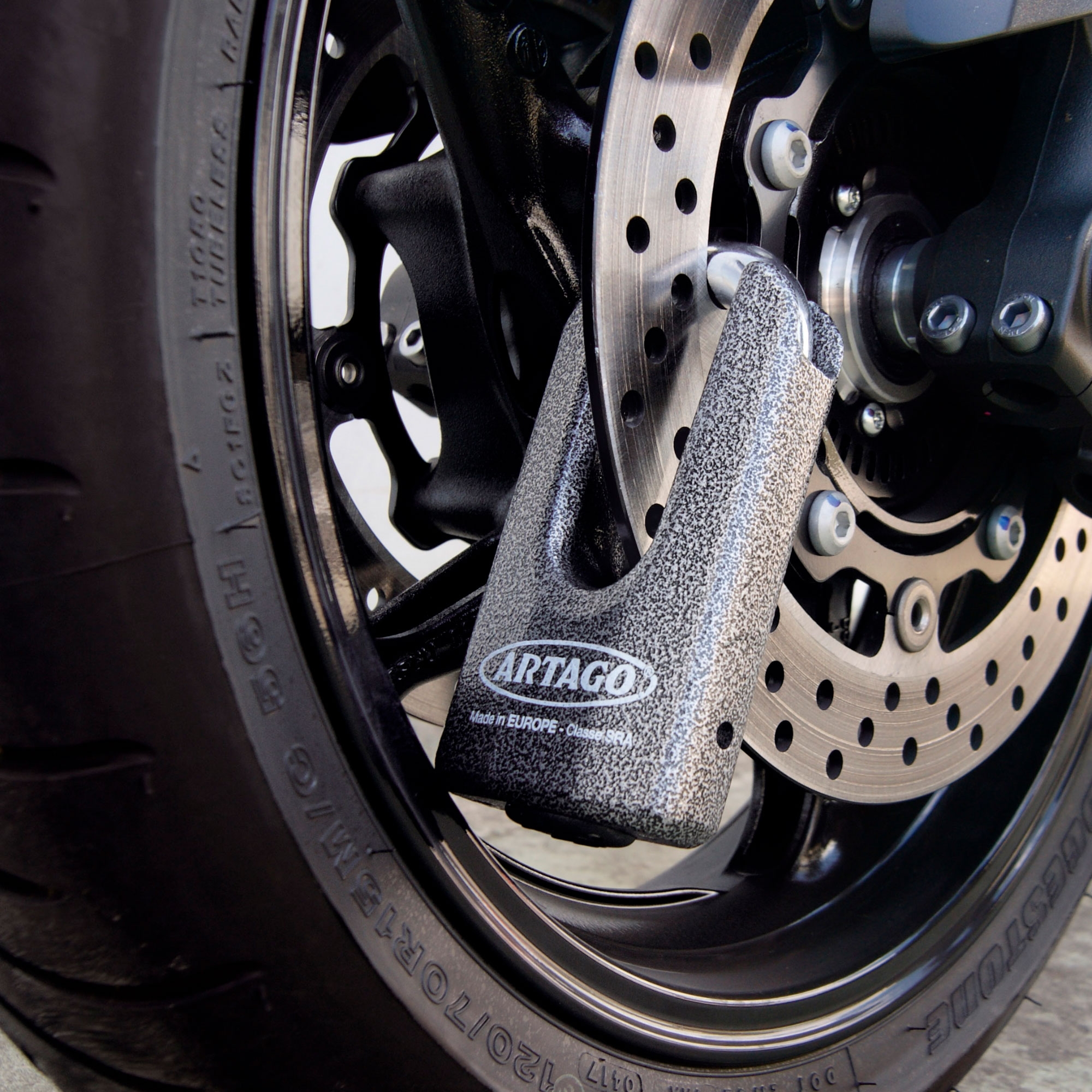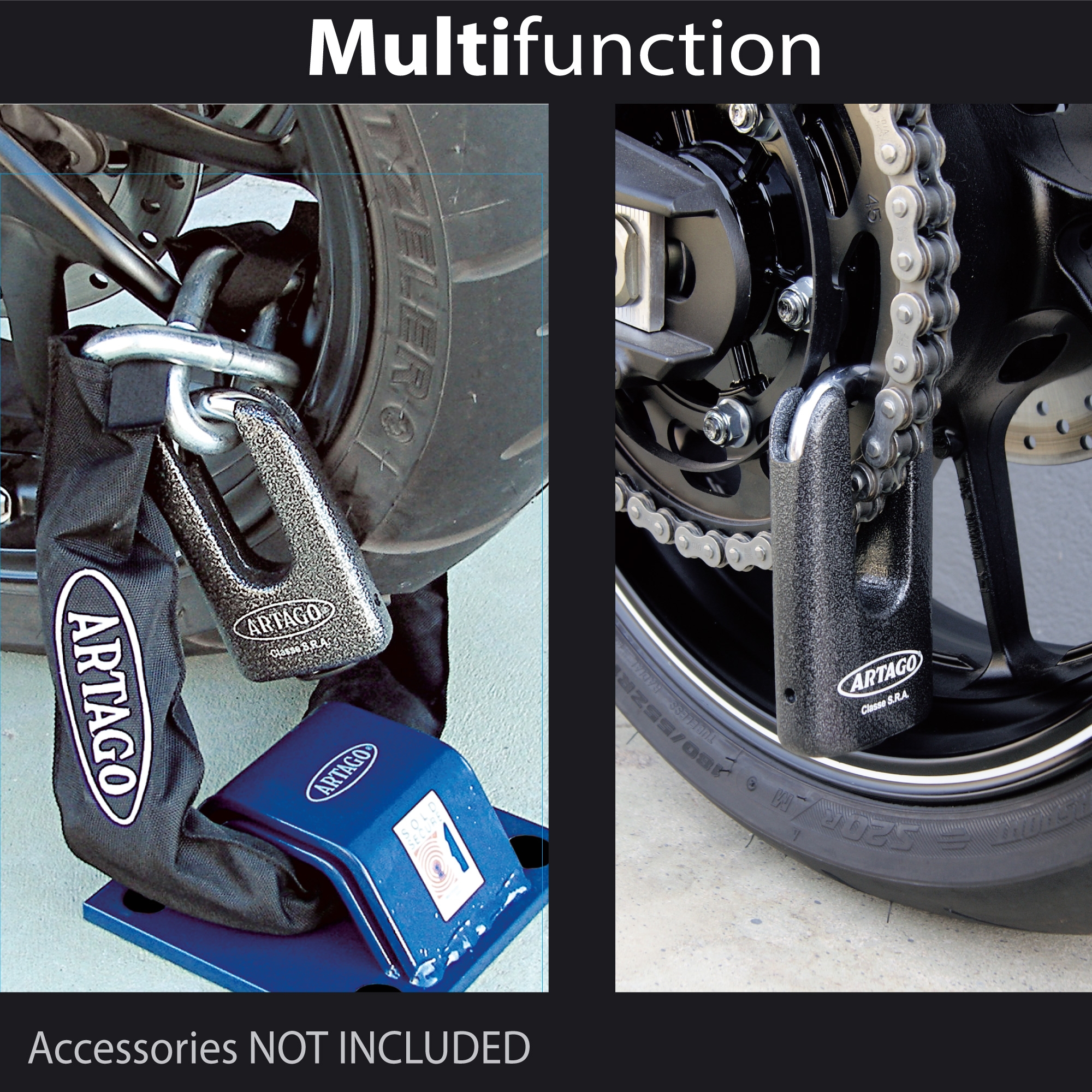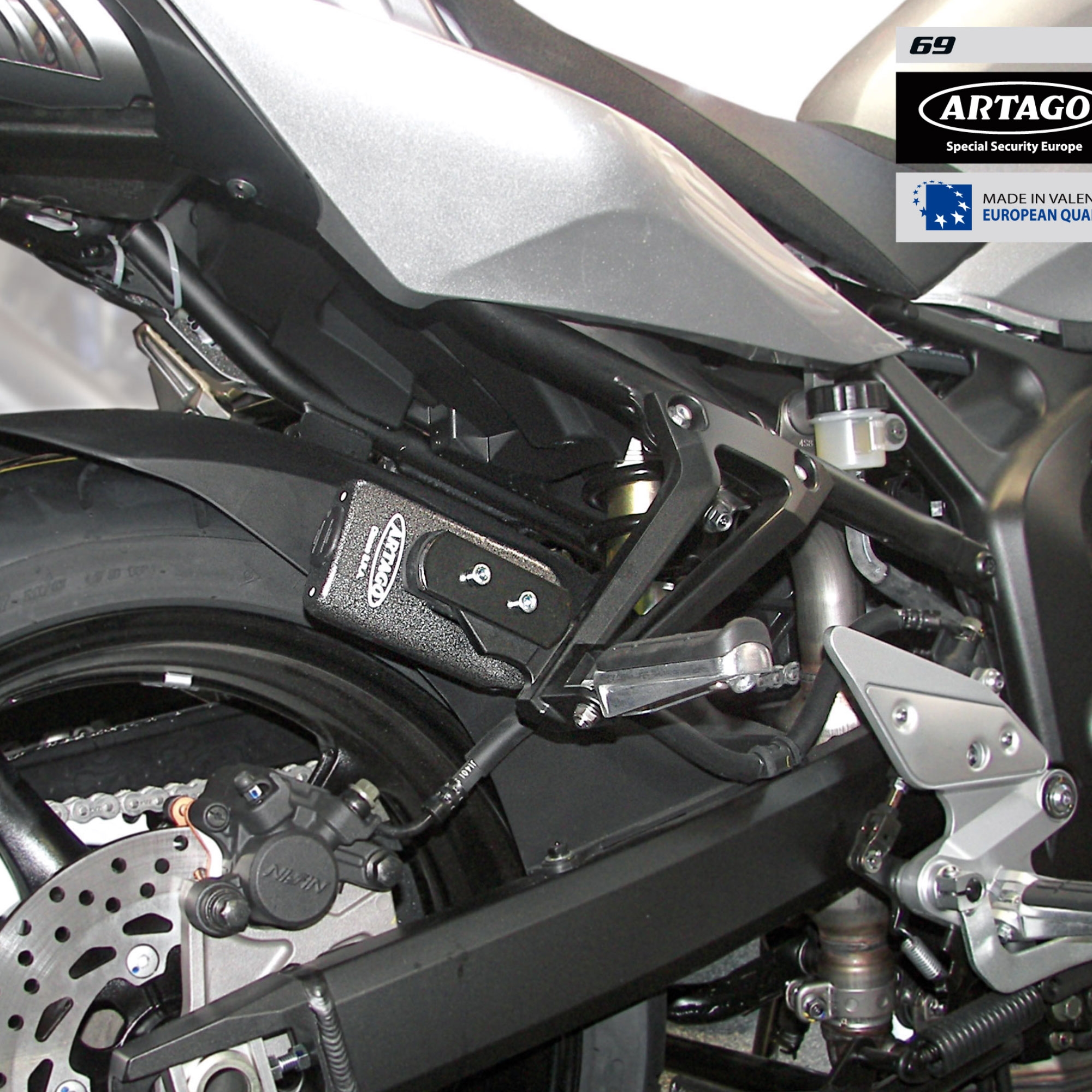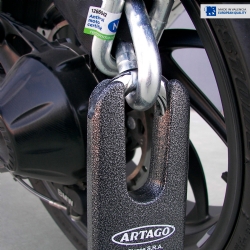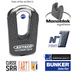 Antirrobo disco Artago 69T/B Monoblock. El 69 de Artago es la Mini U más potente y polivalente del mercado. Puro acero forjado de máximo nivel y nº1 en los tests comparativos, definen al 69. Para el disco delantero o trasero, la corona, o para combinarlo con cadena de seguridad, combina con los exclusivos kits de integración y soportes universales.