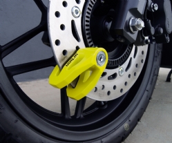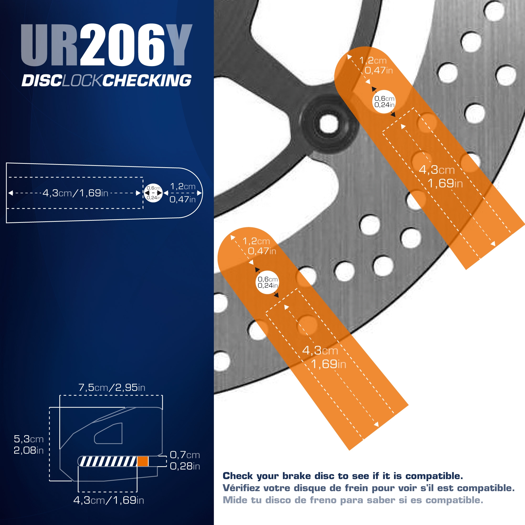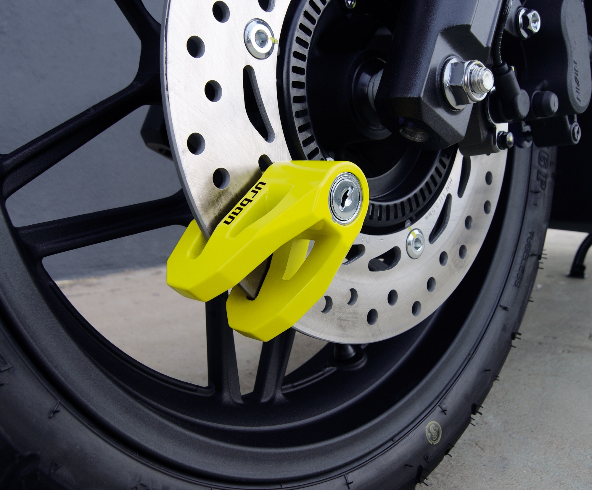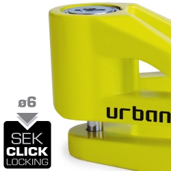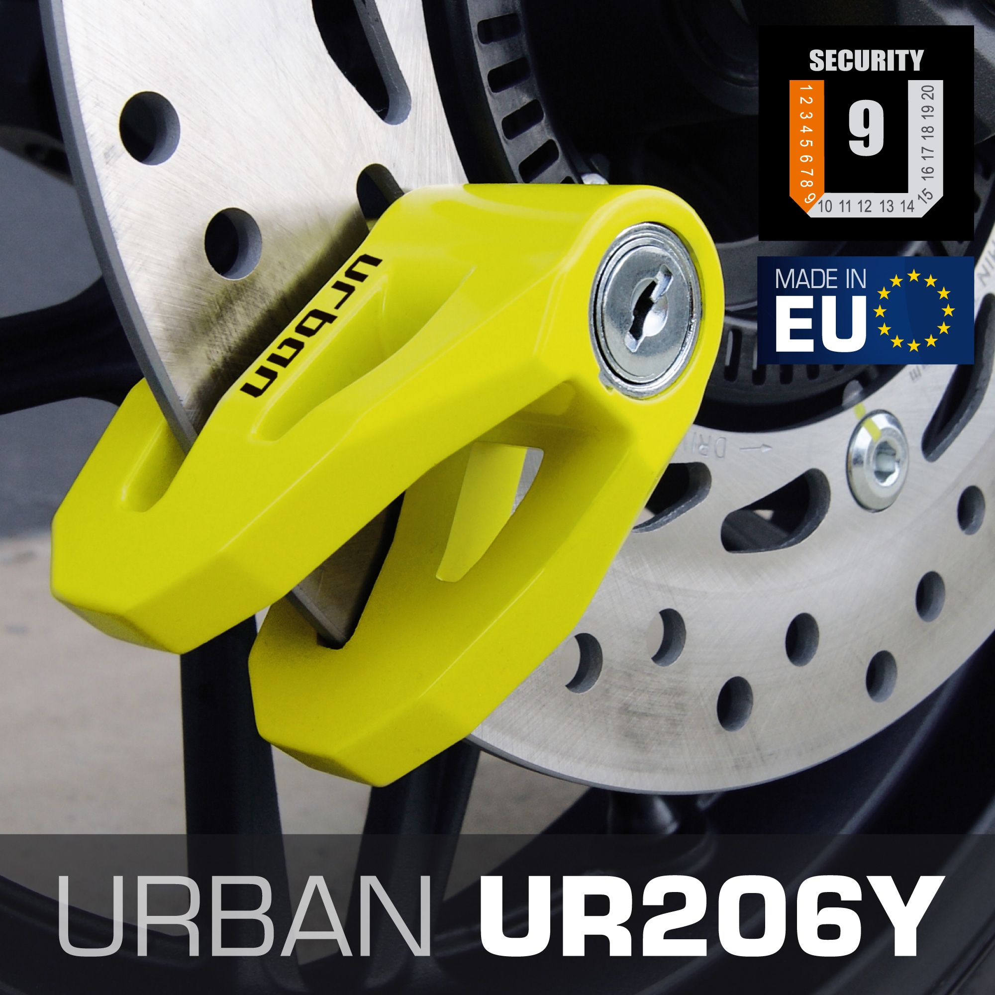 Antirrobo disco Urban Security UR206Y. El antirrobo de disco Urban UR206 ofrece la combinación perfecta entre ligereza y resistencia, gracias a su ingenioso diseño basado solamente en lo esencial y que permite obtener un peso más ligero sin verse afectada la resistencia estructural del antirrobo. De hecho es todo lo contrario, se ha visto aumentada, gracias a sus dos puntos de resistencia. Incorpora la novedosa cerradura SEK CLICK que permite cerrar el UR206 con una sola mano. El Urban UR206 está fabricado en Europa y disponible en dos colores, el UR206T en color titanio y el UR206Y en color amarillo.