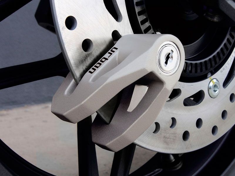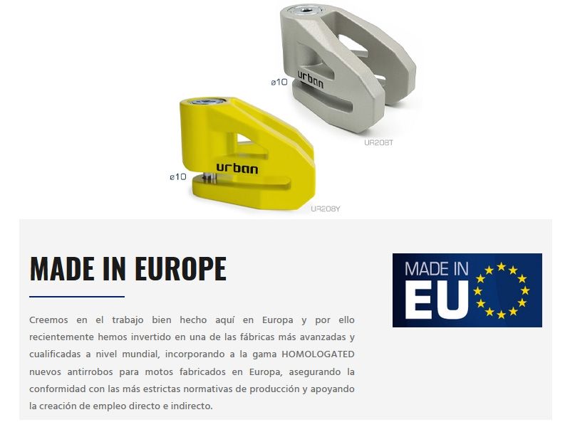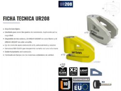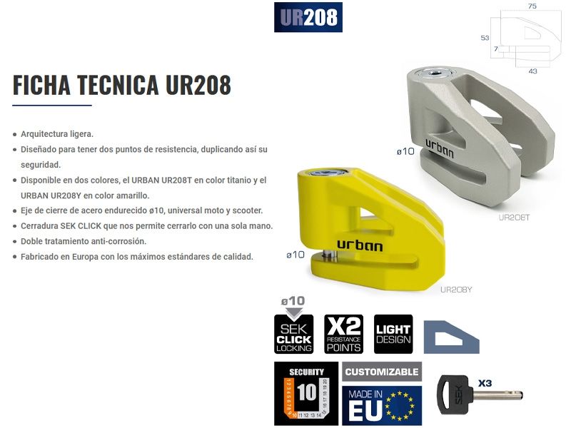 Antirrobo disco Urban Security UR208T. El antirrobo de disco Urban UR208 ofrece la combinación perfecta entre ligereza y resistencia, gracias a su ingenioso diseño basado solamente en lo esencial y que permite obtener un peso más ligero sin verse afectada la resistencia estructural del antirrobo. De hecho es todo lo contrario, se ha visto aumentada, gracias a sus dos puntos de resistencia. Incorpora la novedosa cerradura SEK CLICK que permite cerrar el UR208 con una sola mano. El Urban UR208 está fabricado en Europa y disponible en dos colores, el UR208T en color titanio y el UR208Y en color amarillo.