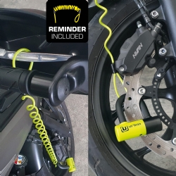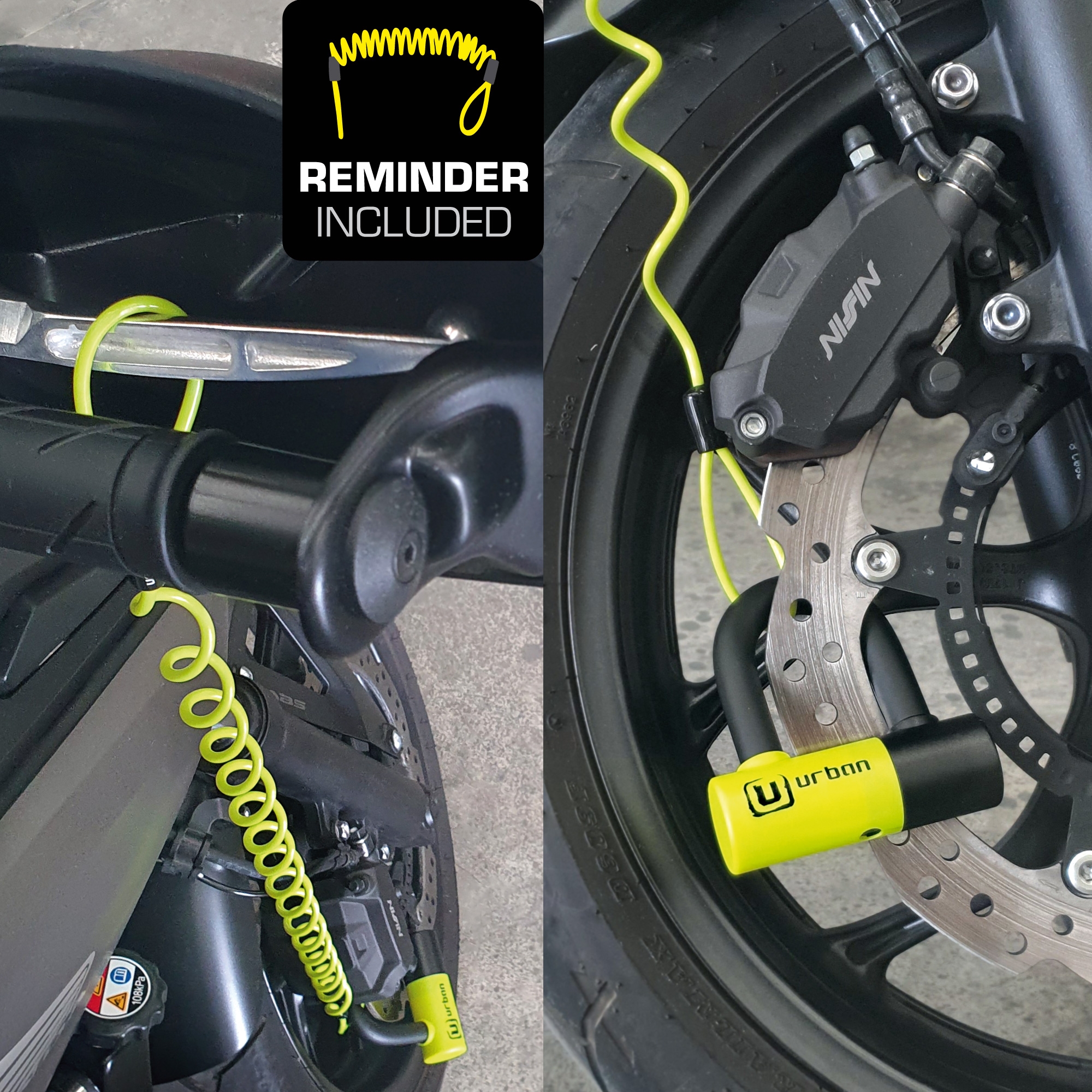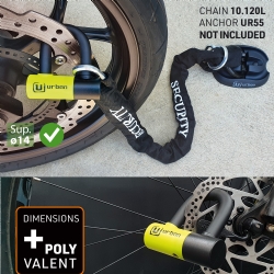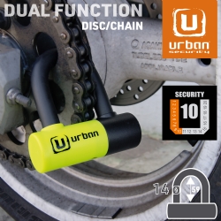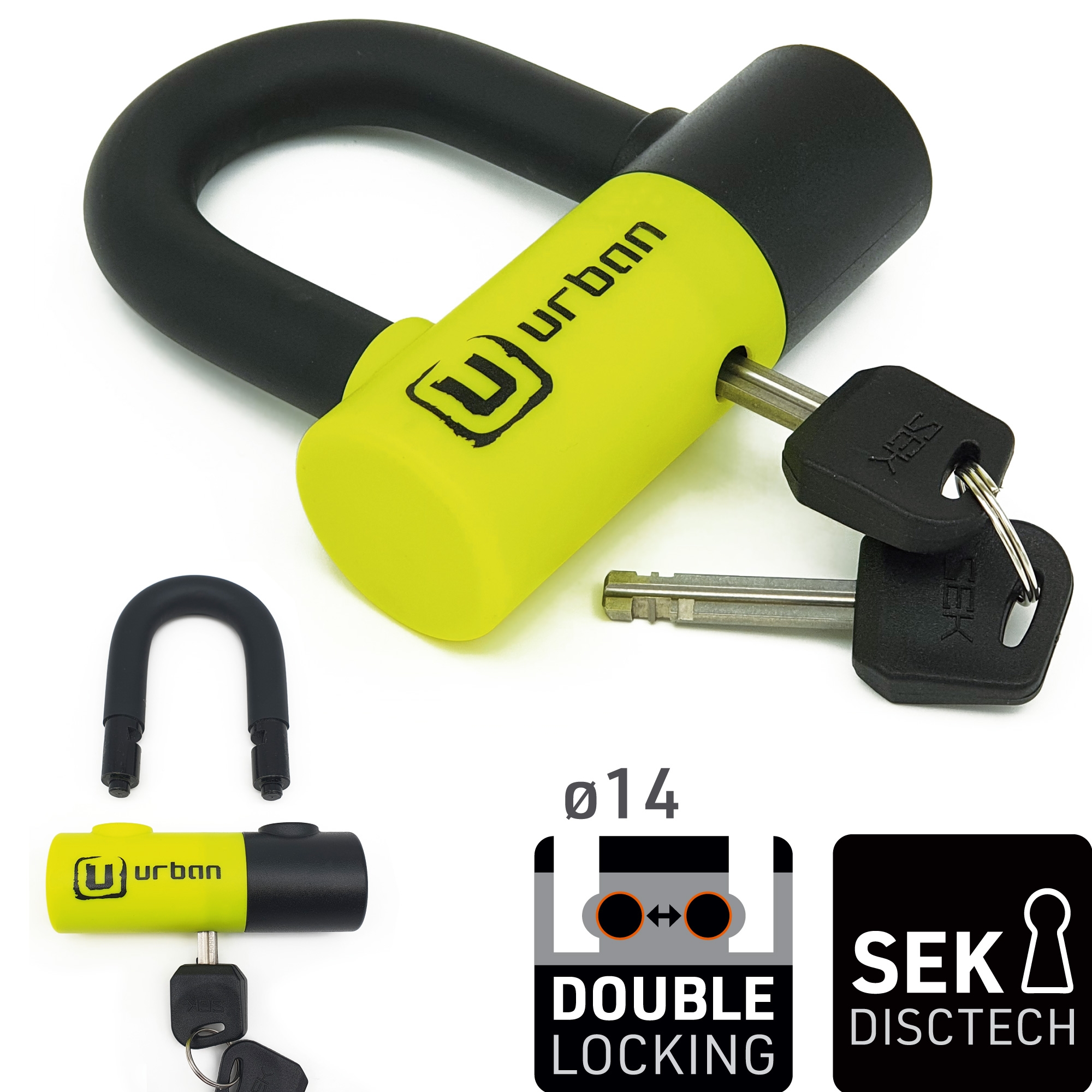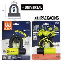 Antirrobo Urban Urban security UR59. Se trata del sucesor del antirrobo Urban 559NMAX. El nuevo antirrobo universal mini U Urban UR59 es muy versátil, ya que ofrece diferentes opciones de uso como por ejemplo en el disco de freno delantero o en la corona de la rueda trasera. También se puede utilizar para combinarlo con una cadena si lo que queremos es anclar la moto a un punto fijo. El Urban UR59 está recomendado para asegurar motos de alta gama en lugares con un alto riesgo de robo. Lo puedes cerrar en el disco de freno delantero, alrededor de la cadena de la rueda trasera o incluso combinarlo con cadena y anclarlo a un elemento externo. Posee un arco de cierre de 14mm de diámetro muy resistente con sistema de doble cierre que bloquea la horquilla por sus dos puntas, duplicando así su resistencia a los posibles ataques. La cerradura de discos anti-ganzúa que monta es realmente segura. La mini U Urban UR59 está recomendada para asegurar motos y scooters en lugares con un riesgo de robo intermedio.