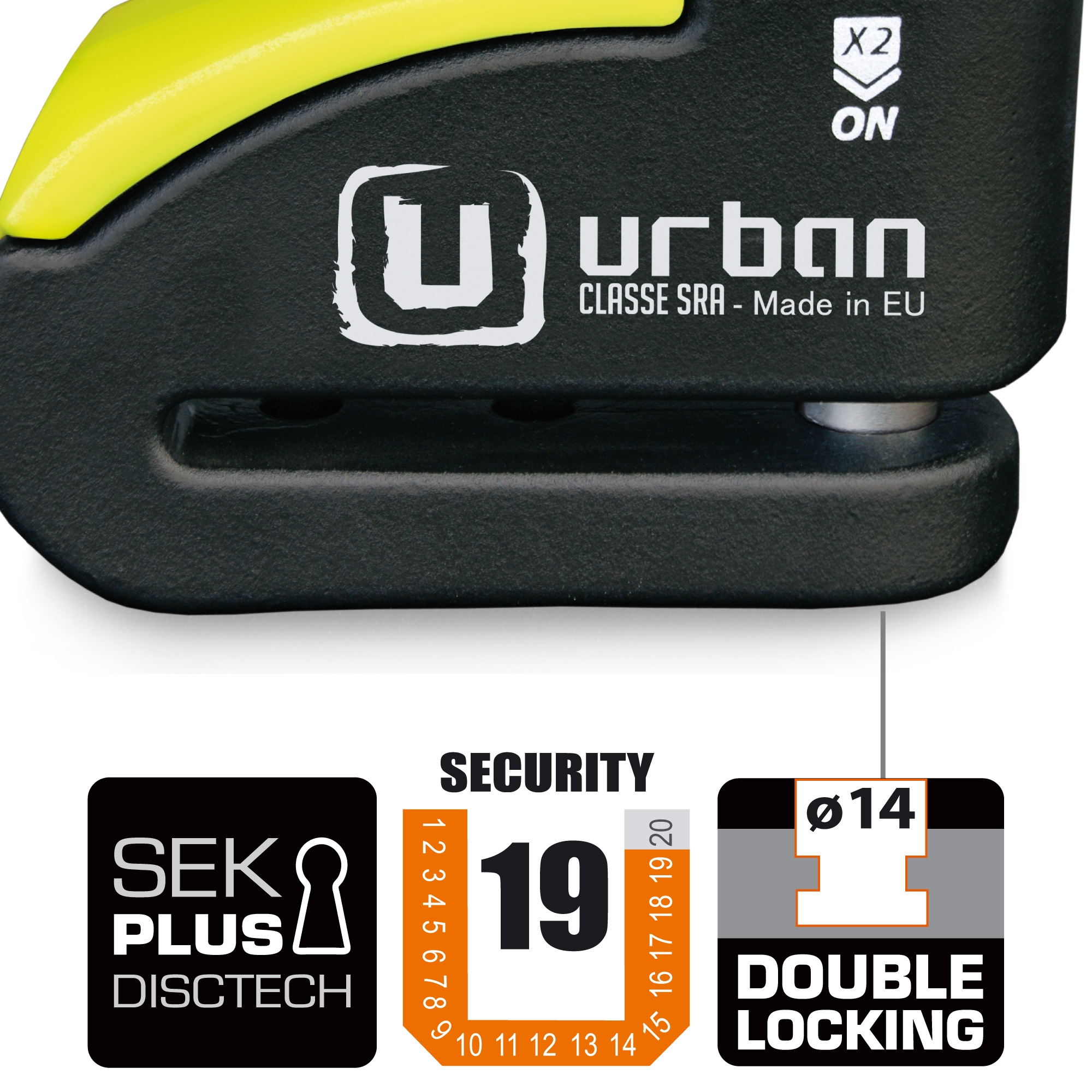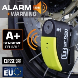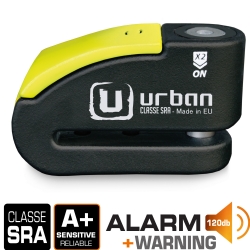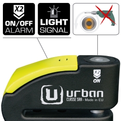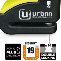 Antirrobo disco alarma Urban Security 999. Antirrobo de disco con alarma diseñado con los estándares de calidad más altos y destinado a usuarios que buscan lo mejor en seguridad para su moto. El antirrobo Urban Security 999 posee la homologación CLASSE SRA y está fabricado con acero endurecido de máxima resistencia. Incorpora la cerradura de última generación SEK PLUS DISCTECH con eje de cierre de diámetro 14 y el sistema de doble cierre de ultima generación que bloquea el eje tanto por la zona de la cerradura como por la base, consiguiendo así el doble de resistencia contra posibles ataques. En cuanto a la alarma lumínica (led) y sonora (120db), podrás decidir si la activas o no, según la necesidad de cada momento. Con el antirrobo Urban 999 dispones de dos antirrobos en uno, pudiendo utilizarlo de manera mecánica más electrónica o sólo mecánica. Haz click aquí para descargar las instrucciones.