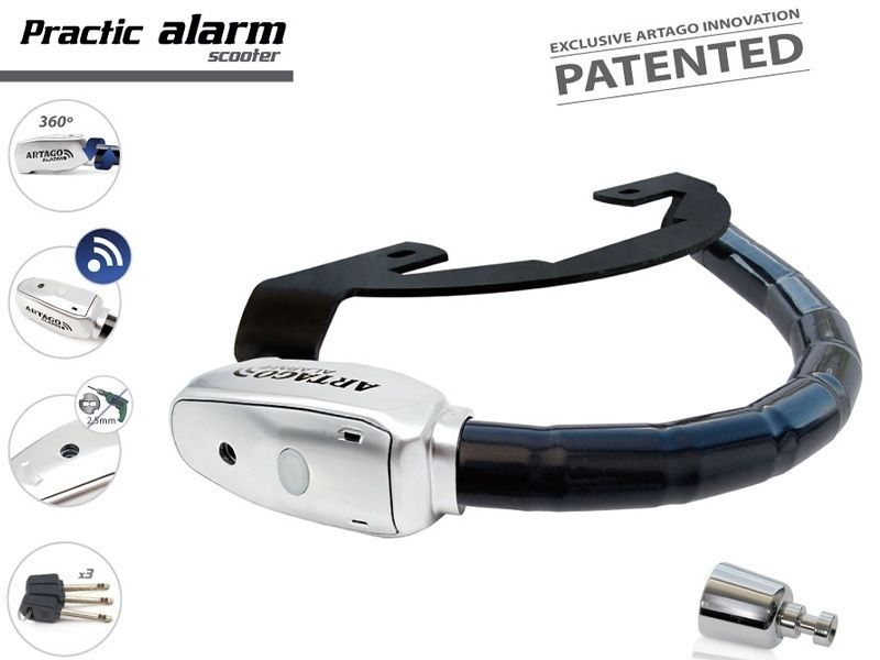 Antirrobo scooter Artago 1711ALM Practic Alarm Piaggio MP3 400 HPE 2022-2023. Gracias a la tecnología desarrollada por Artago Secure, el Practic Alarm es un antirrobo 2 en 1: candado + alarma. Es casi como ponerle una alarma a la scooter pero sin conexiones ni riesgo de dañar la batería de la scooter. Además de bloquear el manillar, y permitirte atar tu casco integral o modular. El Practic Alarm es resultado de una fuerte inversión para ofrecer a los usuarios y profesionales el antirrobo de scooter más exclusivo e innovador, desarrollado y patentado por la fábrica Artago Secure.
