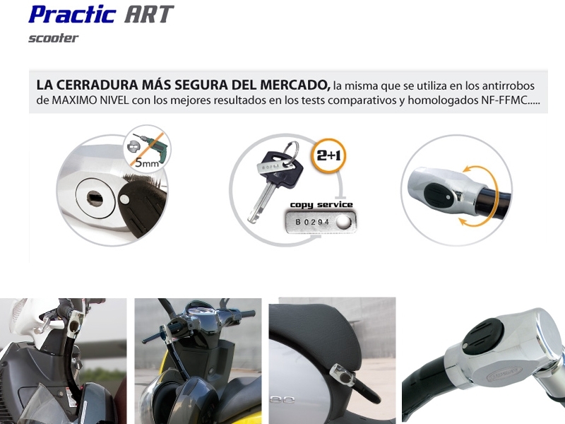 Antirrobo scooter Artago Practic Art 1686ART HONDA FORZA 750 2021. El antirrobo Artago 1686ART Practic Art es el modelo más alto de la gama Practic. Este antirrobo se caracteriza por la gran seguridad que ofrece, pero sobre todo, por lo práctico y cómo que es de usar. La cerradura del Practic Art está considerada de máximo nivel y como la más segura de mercado. Esta cerradura es anti-ganzúa y dispone de un disco anti-taladro de 5 mm (obtiene los mejores resultados en los test comparativos y homologados NF-FFMC). El cuerpo de cierre giratorio y totalmente blindado, ofrece más seguridad además de ser más práctico. El cable está compuesto por acero blindado con casquillos y bolas también de acero. Su. La tapa de la cerradura es deslizante para evitar la entrada de suciedad o humedad. Incluye 2 llaves reversibles con sistema de click. Más información con lista de modelos en el PDF Adjunto. La imagen mostrada es genérica.
