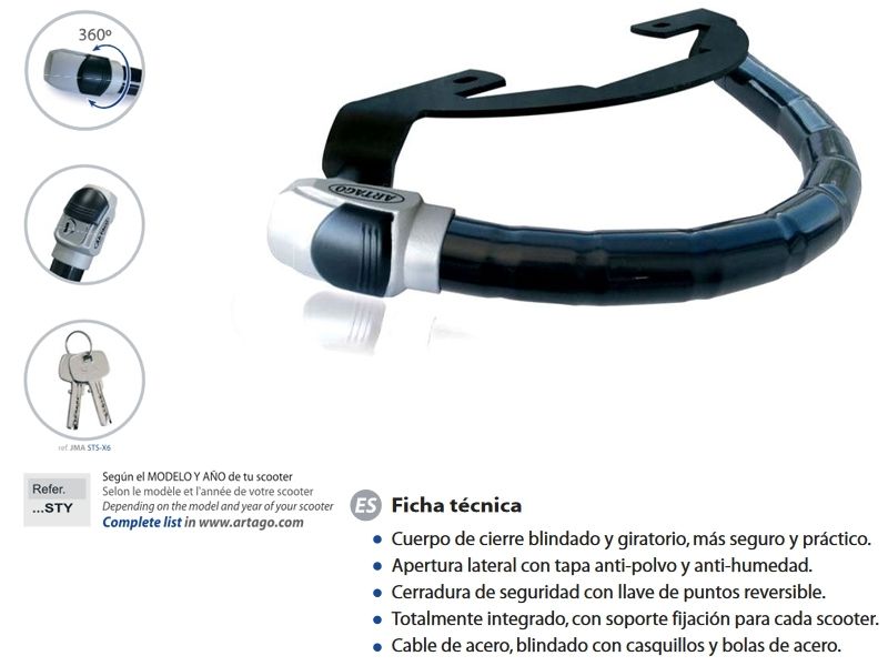 Antirrobo scooter Artago 1705STY Practic Art Sym Jet X 125 E5 2021-2023. El antirrobo Artago 1705STY Practic Style ofrece un alto nivel de seguridad con la mayor practicidad. Diseñado en exclusiva para la gran mayoría de scooters, el Practic Style de Artago es más cómodo de usar que los antirrobos convencionales. Esta versión se caracteriza por su sistema de cabezal giratorio y cerradura de seguridad con llave de puntos reversible. La tapa deslizante en la cerradura no permite la entrada de la suciedad o humedad. El cable interior está fabricado en acero y blindado con casquillos y bolas también de acero. Su diseño permite una integración perfecta en cada modelo de scooter. Más información con lista de modelos en el PDF Adjunto. La imagen mostrada es genérica.