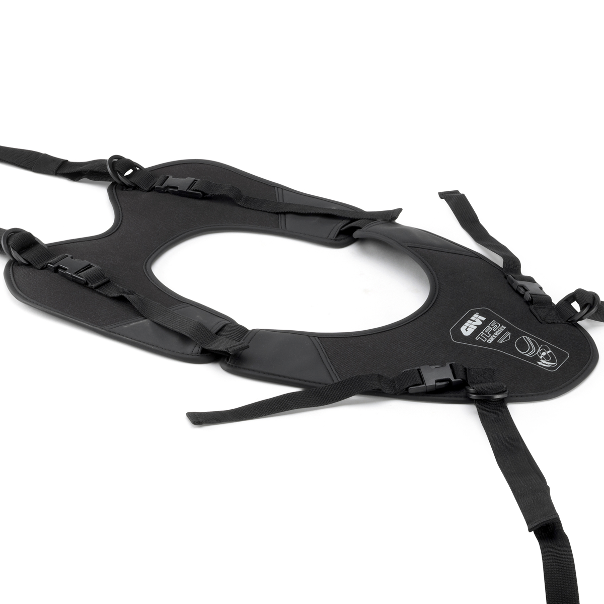 Accesorio Givi T-460B. Base universal para bolsas depósito, Tank Fitting System (TFS). El sistema TFS ha estado estudiado para simplificar la fijación de la bolsa a depósitos de plástico que, a diferencia de los metálicos, no pueden fijarse a través de imanes. Esta constituido de un folio de poliester laminado EVA y revestido en PVC antideslizante que una vez fijado a la moto a través de 4 correas regulables, constituye la base para fijar y desenganchar la bolsa rápidamente a la moto. Las medidas del TFS (ver esquema) se adapta a la mayoría de motos y el sistema permite fijar todas las bolsas depósito de nuestra producción excepto las bolsas Tanklock.