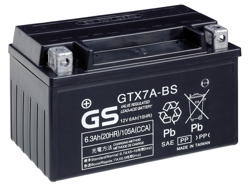 Batería GS by Yuasa GTX7A-BS. La batería GS Battery GTX7A-BS se caracteriza por ofrecer la máxima fiablilidad con el mayor poder de arranque. Esta batería utiliza la tecnología Selead Mf (libre de mantenimiento), completamente hermética y que solo se precisa llenar de ácido en el momento de su instalación.