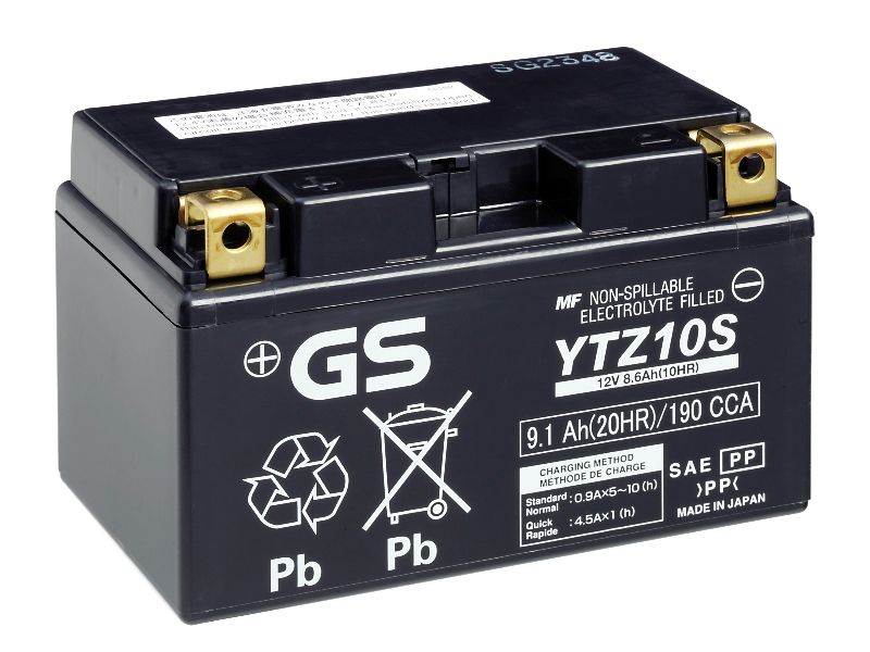 Batería GS by Yuasa YTZ10S. La batería de moto GS Battery YTZ10S, utiliza el sistema Premium AGM; cargadas de fábrica. Sus principales características son la máxima fiabilidad con el máximo poder de arranque. Esta batería es de gel (libre de mantenimiento), completamente hermética y que no precisa de ácido.