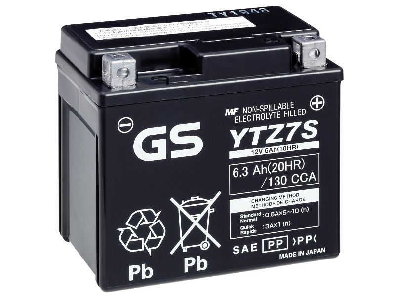 Batería GS by Yuasa YTZ7S. La batería de moto GS Battery YTZ7S, utiliza el sistema Premium AGM; cargadas de fábrica. Sus principales características son la máxima fiabilidad con el máximo poder de arranque. Esta batería es de gel (libre de mantenimiento), completamente hermética y que no precisa de ácido.