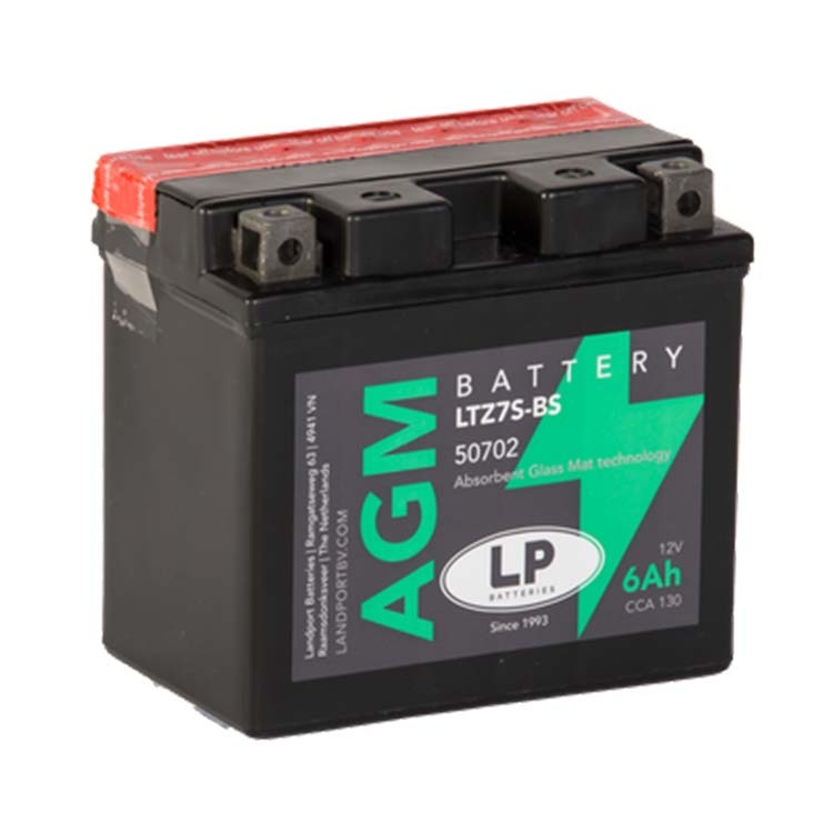 Batería Landport LTZ7S-BS (equivalente YTZ7S-BS) — AGM 12V 6Ah, 130A EN. La Landport LTZ7S-BS es una batería de arranque AGM de 12V y 6Ah (10h), diseñada para ofrecer potencia estable, baja autodescarga y buena resistencia a vibraciones en el uso diario. Se entrega pre-cargada en seco (DRY) con pack de ácido incluido: tras llenado y carga inicial, queda 100% libre de mantenimiento y estanca (a prueba de derrames). Admite instalación inclinada hasta 45°, ideal para uso estacional y trayectos cortos.