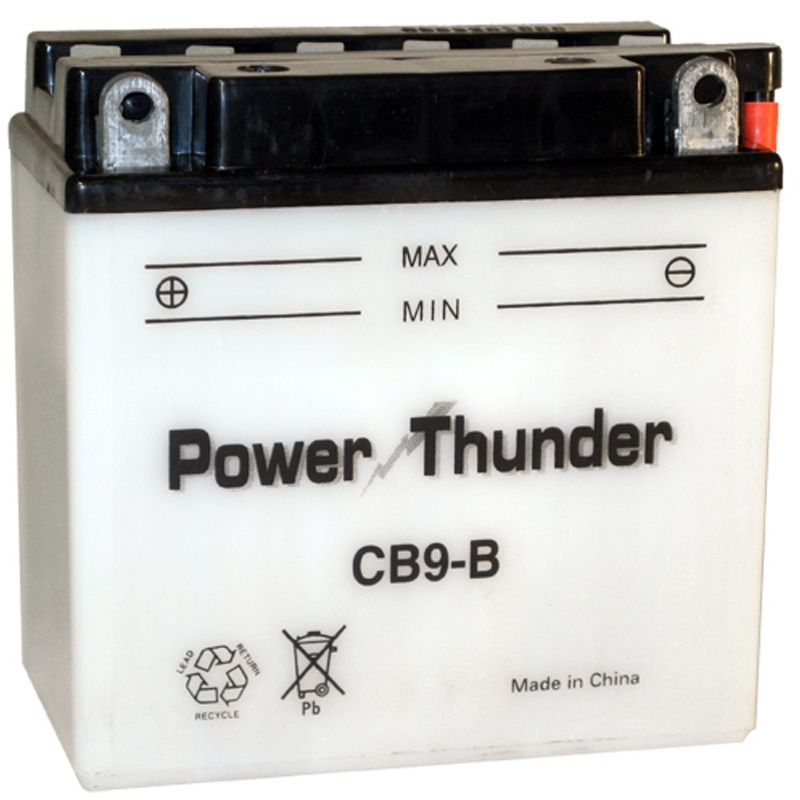 Bateria Power Thunder CB9-B. Batería Power Thunder CB9-B para motocicletas. La batería Power Thunder CB9-B es una solución confiable y resistente diseñada para ofrecer un rendimiento óptimo en motocicletas. Con una construcción robusta y una excelente resistencia a la corrosión, esta batería convencional está preparada para responder incluso en condiciones climáticas adversas, asegurando un arranque fiable y una larga vida útil.