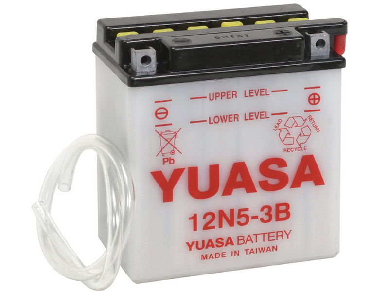 Batería Yuasa 12N5-3B. Una batería diseñada para proteger la corrosión, resistir vibraciones y dar un alto poder de arranque. La batería Yuasa 12N5-3B incluye el ácido en la caja.